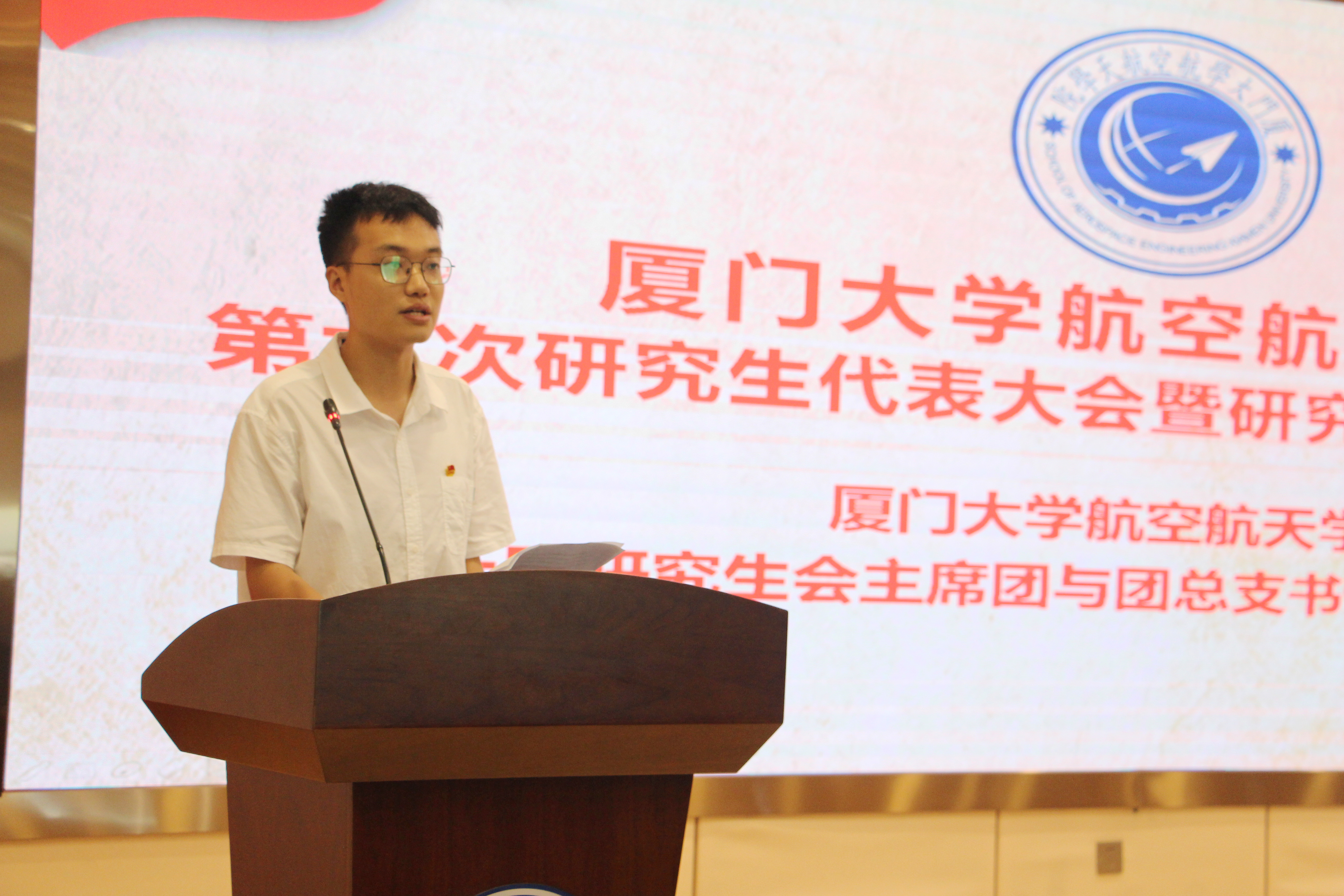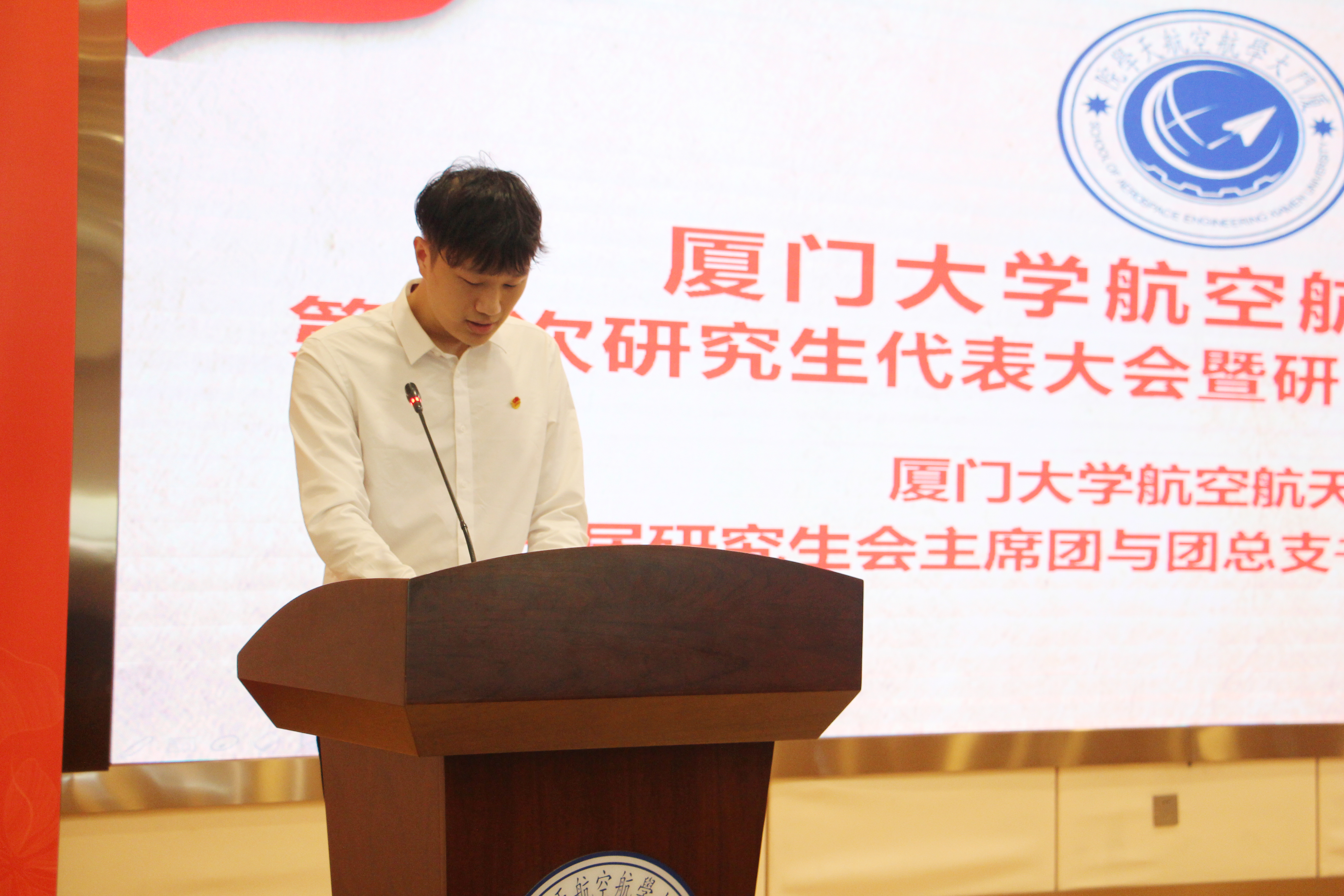 7月22日下午,航空航天学院第九次研究生代表大会暨研究生团员代表大会在院楼547报告厅顺利举行。学院党委副书记林蔚,团委书记郭江淮,团委副书记倪建超、施晨、董佳闻,学生兼职团委副书记、辅导员于波,校研究生会主席团成员刘阳以及信息学院、能源学院、萨本栋微米纳米科学技术研究院、电子科学与技术学院、生命科学学院、药学院、医学院、海洋与地球学院、环境与生态学院等兄弟学院研究生会主席团成员,学院各年级研究生代表出席大会。大会由学院学生兼职团委副书记张思韫主持。