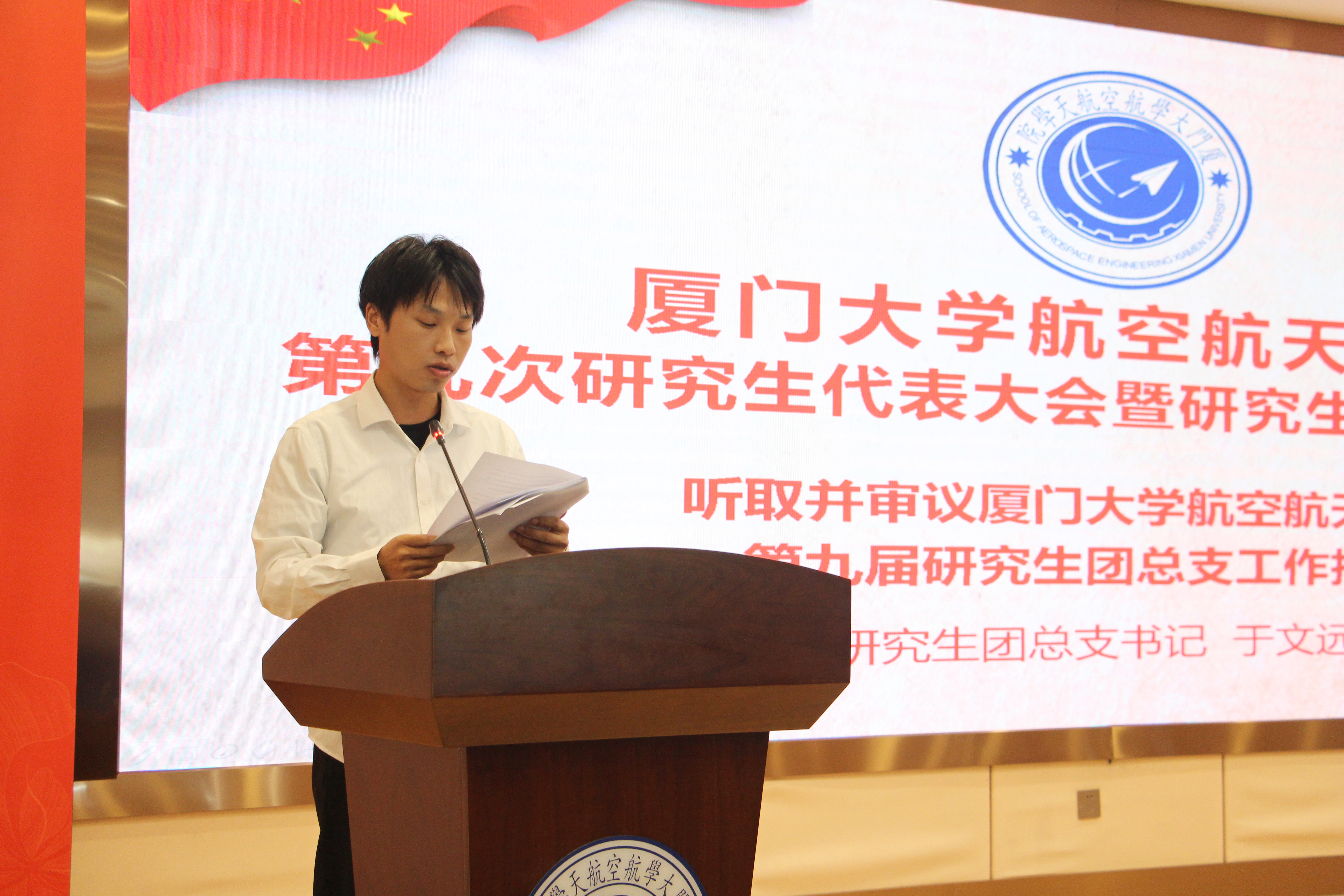 大会正式会议阶段,与会代表听取并审议了由研究生会执行主席黄泷章所作的航空航天学院第九届研究生会工作报告,由研究生团总支书记于文远所作的第九届研究生团总支工作报告。审议并通过了由研究生会主席团成员黄泷章所作的《航空航天学院研究生会章程(审议案)报告》、团总支书记于文远所作的《航空航天学院研究生团总支章程(审议案)报告》和由研究生会主席团成员林君健所宣读的《航空航天学院第九次研究生代表大会暨研究生团员代表大会选举办法(审议案)》。审议并通过了委员候选人建议名单、大会选举办法和监票人、计票人建议名单。
