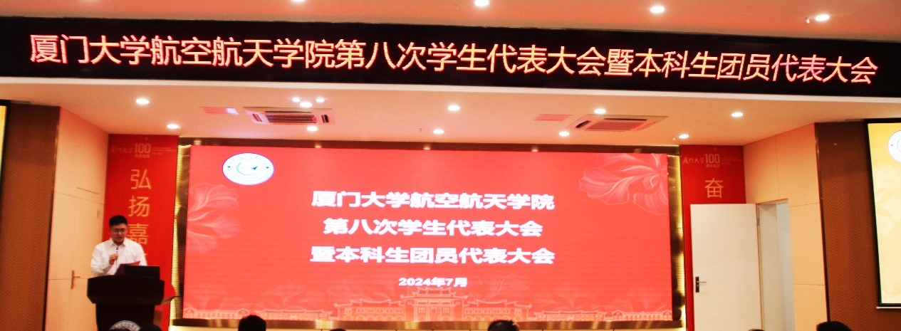 为深入总结过去一年航空航天学院学生会和本科团总支的工作,推动本科团学组织新一学年工作再上新台阶,7月15日晚,学院第八次学生代表大会暨本科生团员代表大会在院楼547报告厅如期举行。学院党委副书记王寒,团委书记郭江淮,团委副书记施晨、董佳闻,辅导员林威丞、董芬,信息学院、电子科学与技术学院等兄弟学院学生会主席团成员及学院各年级本科生代表出席大会。大会由学院2023级本科生王瑞涵主持。