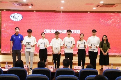 郭江淮、施晨、董佳闻、林威丞、董芬分别为学院第九届学生会及本科团总支工作人员颁发任职证明并合影留念 。