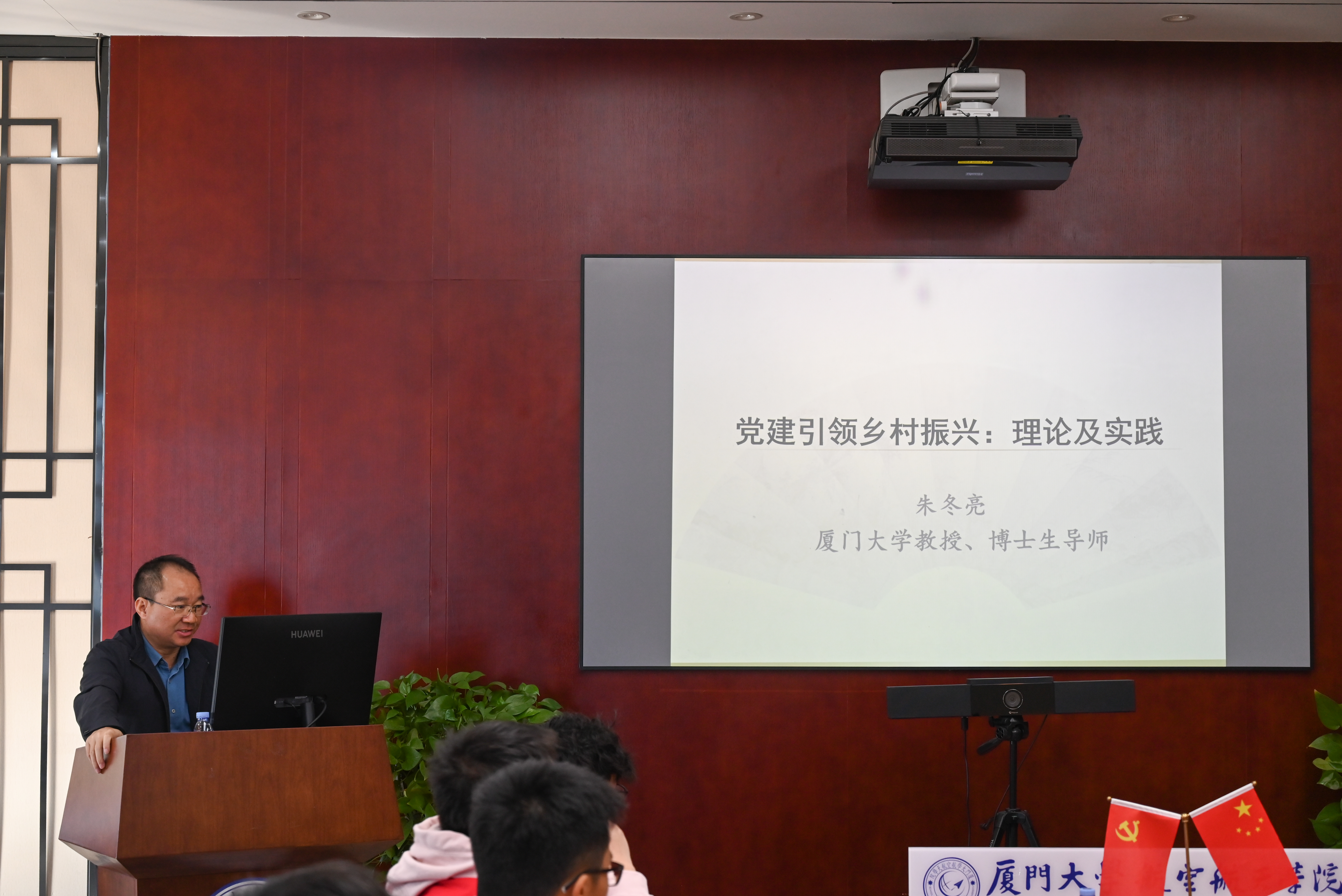 随后,朱冬亮为师生们带来题为《党建引领乡村振兴理论与实践》的专题报告。他围绕党的二十大报告关于乡村振兴战略实施部署、党建引领乡村振兴理论、专题案例探讨三个部分进行授课。他以党的二十大报告关于乡村振兴的重要论述切入,向学员们介绍目前农村所存在的困难与痛点,指出乡村振兴的重要性和必要性;他以福建常口村、广西龙脊梯田等乡村振兴实例为引,深入浅出地为学员介绍在乡村振兴中党建引领凸显的重大意义;最后,他对研习班学员提出了殷切期待,鼓励大家深耕自身学习领域,积极投入到党的建设工作中去,并呼吁学员们身体力行地深入乡村中考察学习,为乡村振兴战略注入青春活力。讲授结束后,与会师生进行了深入的交流研讨。