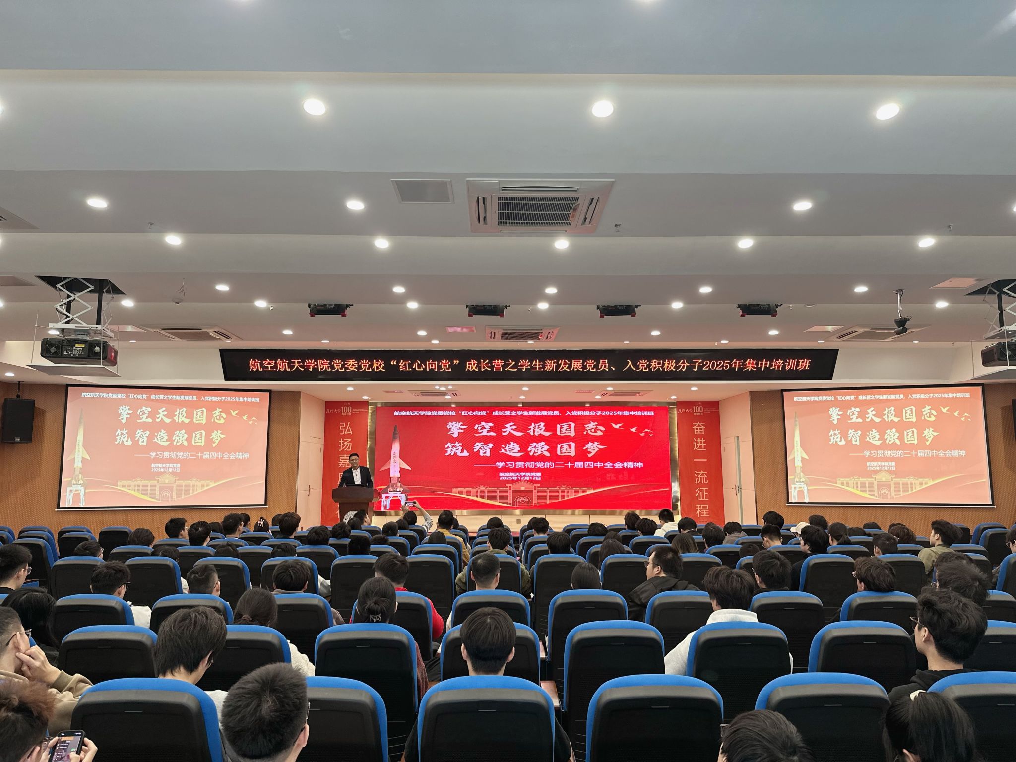 12月12日,航空航天学院党委党校第七期“旗帜工程·党员学堂”暨“红心向党”成长营之学生新发展党员、入党积极分子2025年集中培训班专题党课在航院547报告厅举行。学院党委书记袁国柱为全体学员以《擎空天报国志 筑智造强国梦——学习贯彻党的二十届四中全会精神》为题作专题报告。学院全体辅导员也一同到场学习。