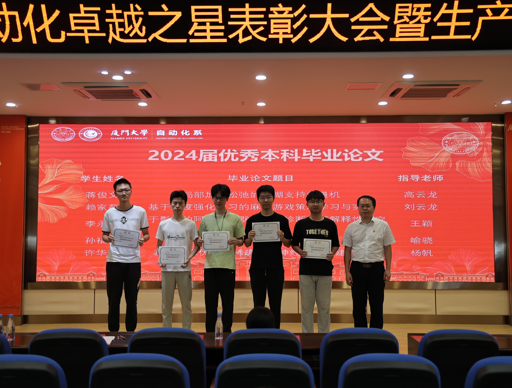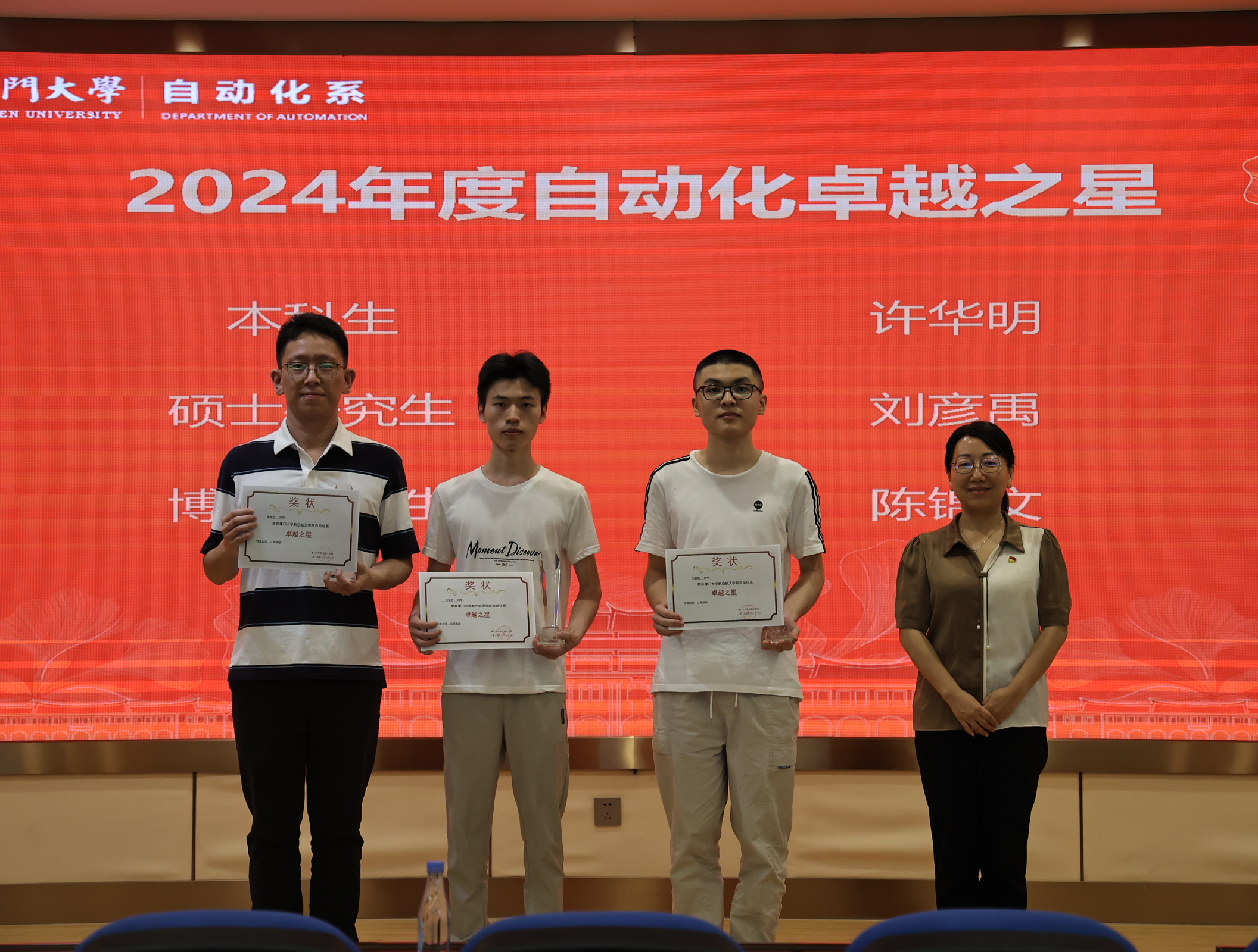 2024届本科生许华明、硕士研究生刘彦禹、博士研究生陈锦文获评2024年度“自动化卓越之星”。廖志丹为3位学生颁授荣誉证书,肯定他们在课业学习、创新创业、学术成长等方面等成就和潜力,勉励获奖同学更上层楼,成为自动化毕业生的典范。