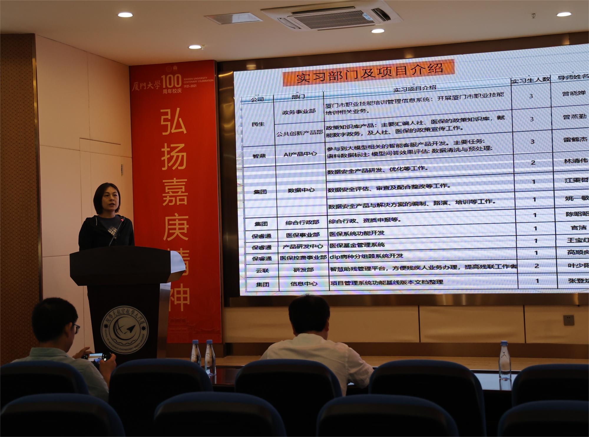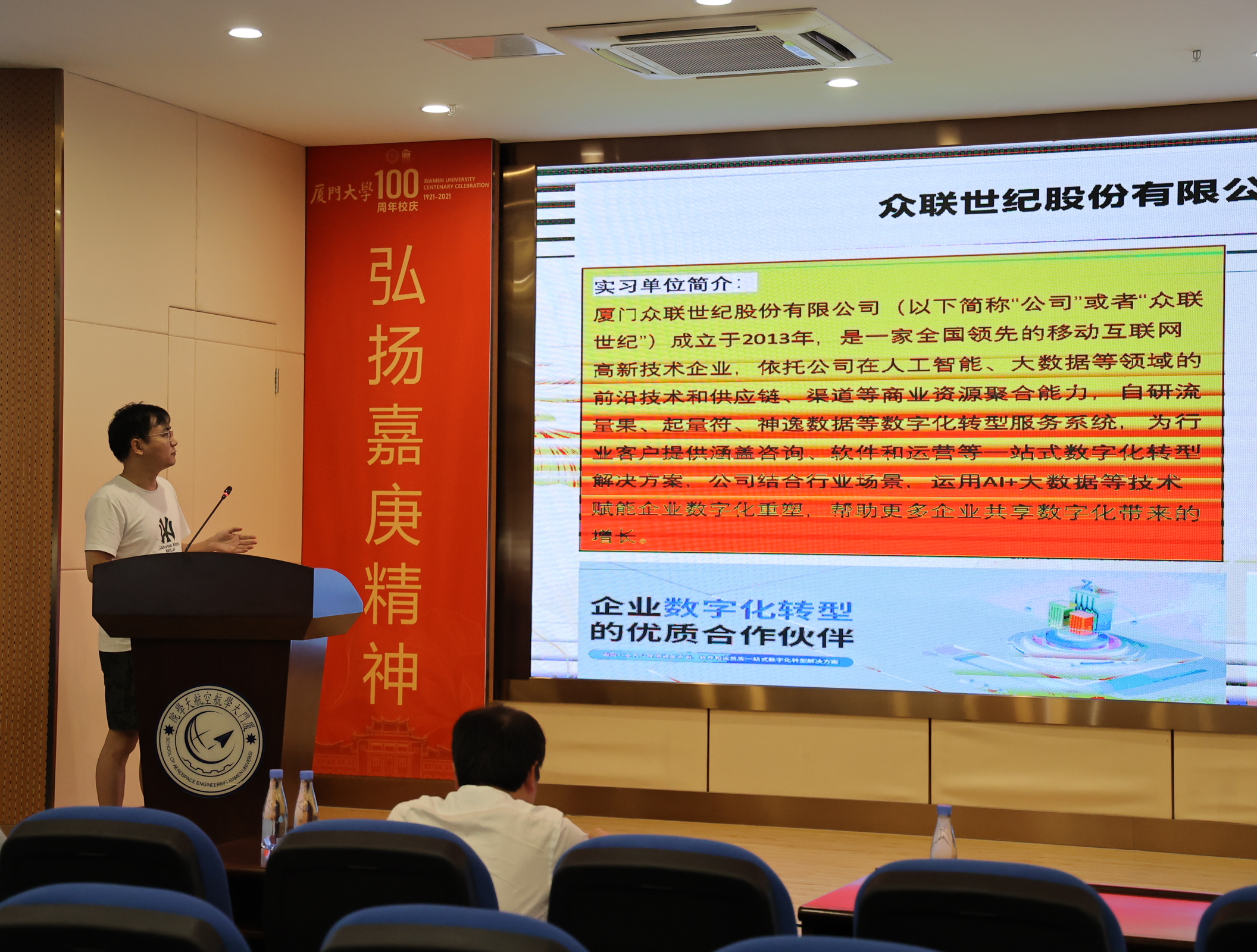 表彰先进,也是为了激励后来者。本次会议随后面向2021级本科生开展了生产实习第一节课。各位带队老师轮流介绍生产实习单位的情况、具体安排及安全事项。首先,洪文兴老师介绍了北京控制工程研究所(502所),该所是集研究、开发、设计、制造、试验与一体的综合性高科技研究所,在国内空间飞行器控制领域处于主导地位。曹浪财老师将带队赴航空工业直升机设计研究所实习,进行飞行器动力学、机械结构、航路规划等方面能力的培养。周绮凤老师介绍了易联众信息技术股份有限公司实习项目,该公司坚持以数据链为基础,重点围绕人力资源和社会保障、医疗保障、卫生健康等民生领域,致力于以数字化重塑民生健康新生态。杨帆老师对厦门众联世纪股份有限公司的实习安排进行介绍,该公司依托在人工智能、大数据等领域的前沿技术,为行业客户提供涵盖咨询、软件和运营等一站式数字化转型解决方案。彭洪老师介绍了厦门路桥信息股份有限公司及厦门天卫科技有限公司的实习项目,旨在培养学生关于遥感信息采集、计算机视觉与数字图像处理的能力。