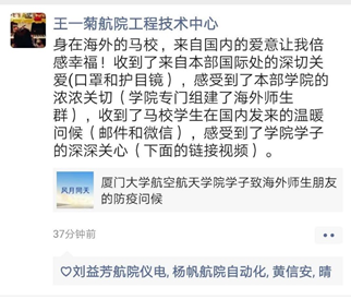 疫情当前,祖国和海外游子相隔千里,情丝不断,厦门大学航空航天学院诚挚希望瘟疫早去,人心得平,山河无恙,四海长安。