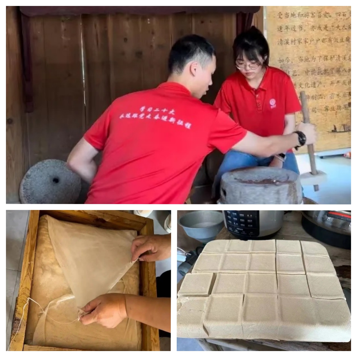 在清溪村豆腐工坊,经过非遗传承人的指导,实践队员一一体验泡豆、磨浆、滤渣、煮浆、点兑、成型六大工序,经过三个多小时的努力亲手制作出了清爽滑嫩的清溪豆腐。见证了豆子到豆腐的华丽蜕变,喝着鲜美的豆浆,品尝着自己亲手制作出的豆腐,队员们难掩内心的喜悦,感触万千。