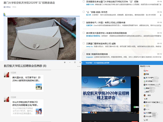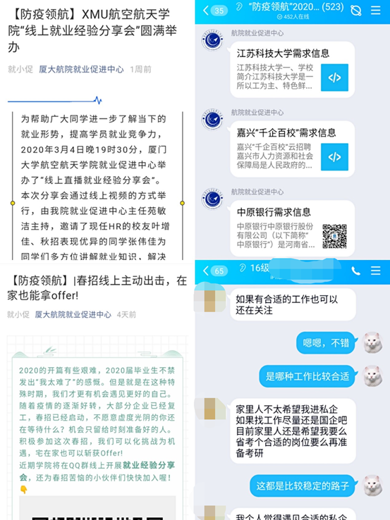 学院开展“防疫领航”就业指导,通过qq群、微信群(覆盖本硕博毕业生517人)和学院官方微信、“厦大航院就业促进中心”等微信公众号进行线上就业指导,每天定时批量推送最新就业信息,共享指导课程和红利政策解读,确保重要信息第一时间覆盖求职群体。