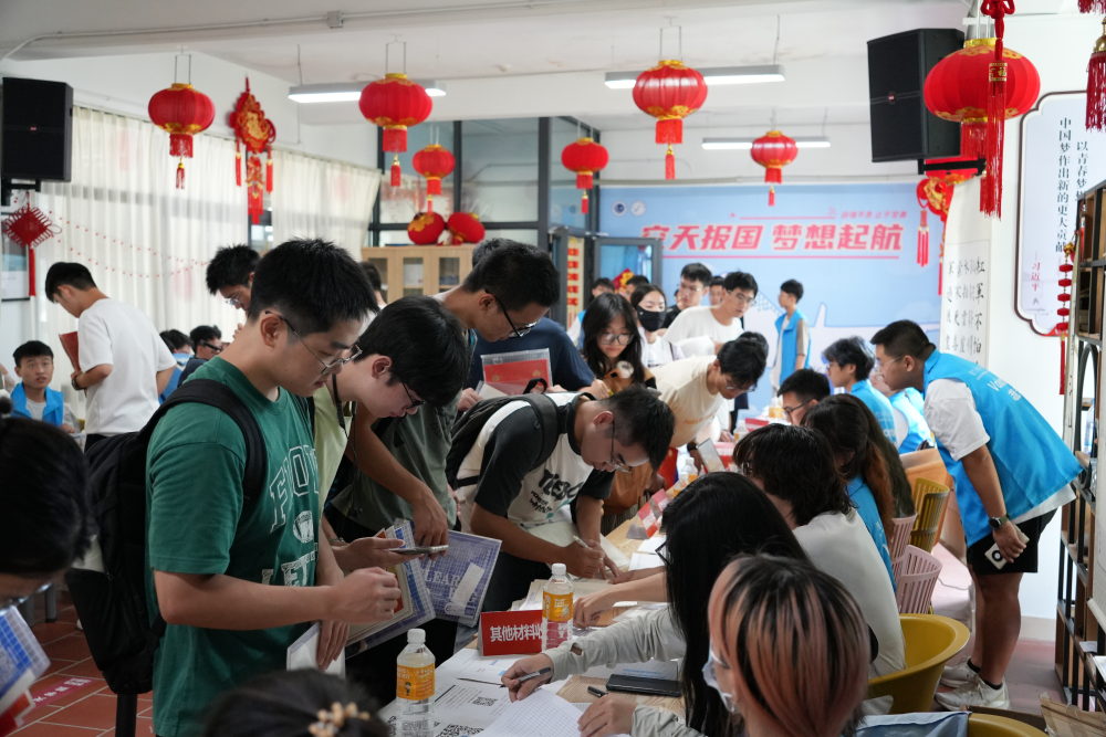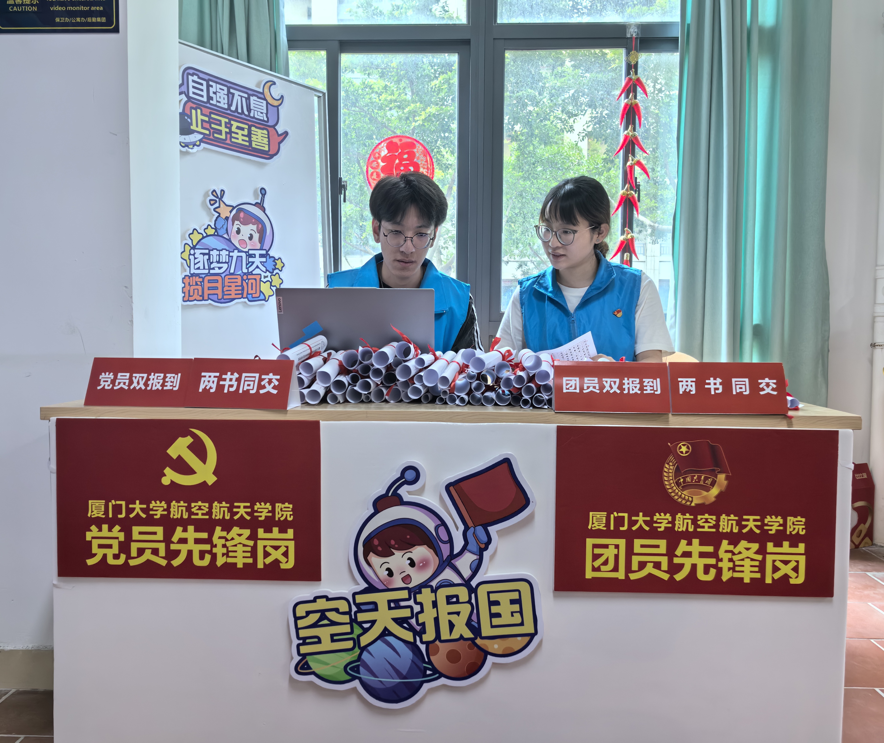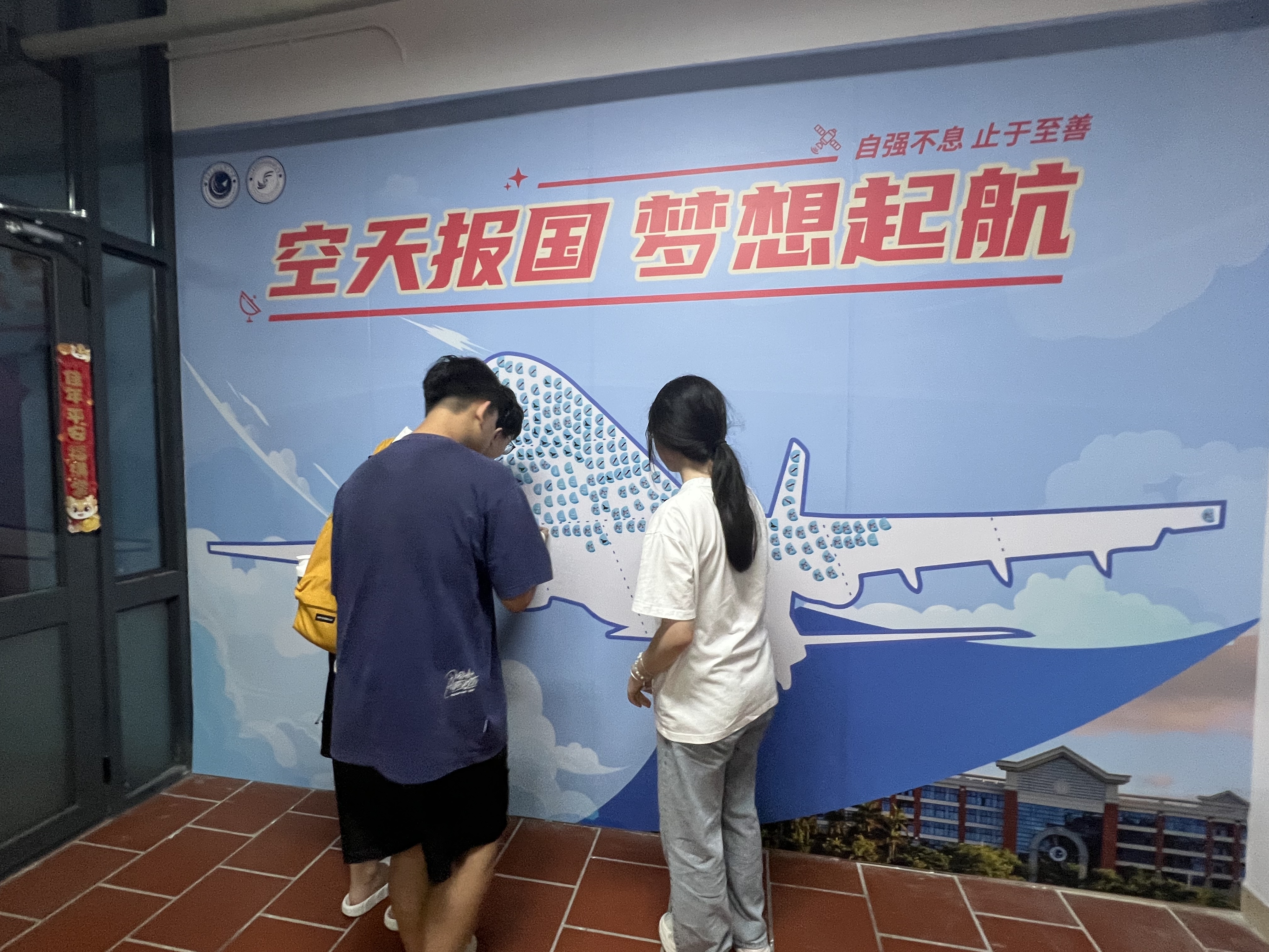 “两书同交”双报到是学院迎新的特色活动,新生们积极向学院提交入党申请书、入团申请书,而他们也将收到一封封包含学长学姐寄语的信件,联接着老生与新生,代表着传承。在“空天报国 梦想起航”的大飞机上贴上纪念章,见证空天报国在这里萌芽生长。