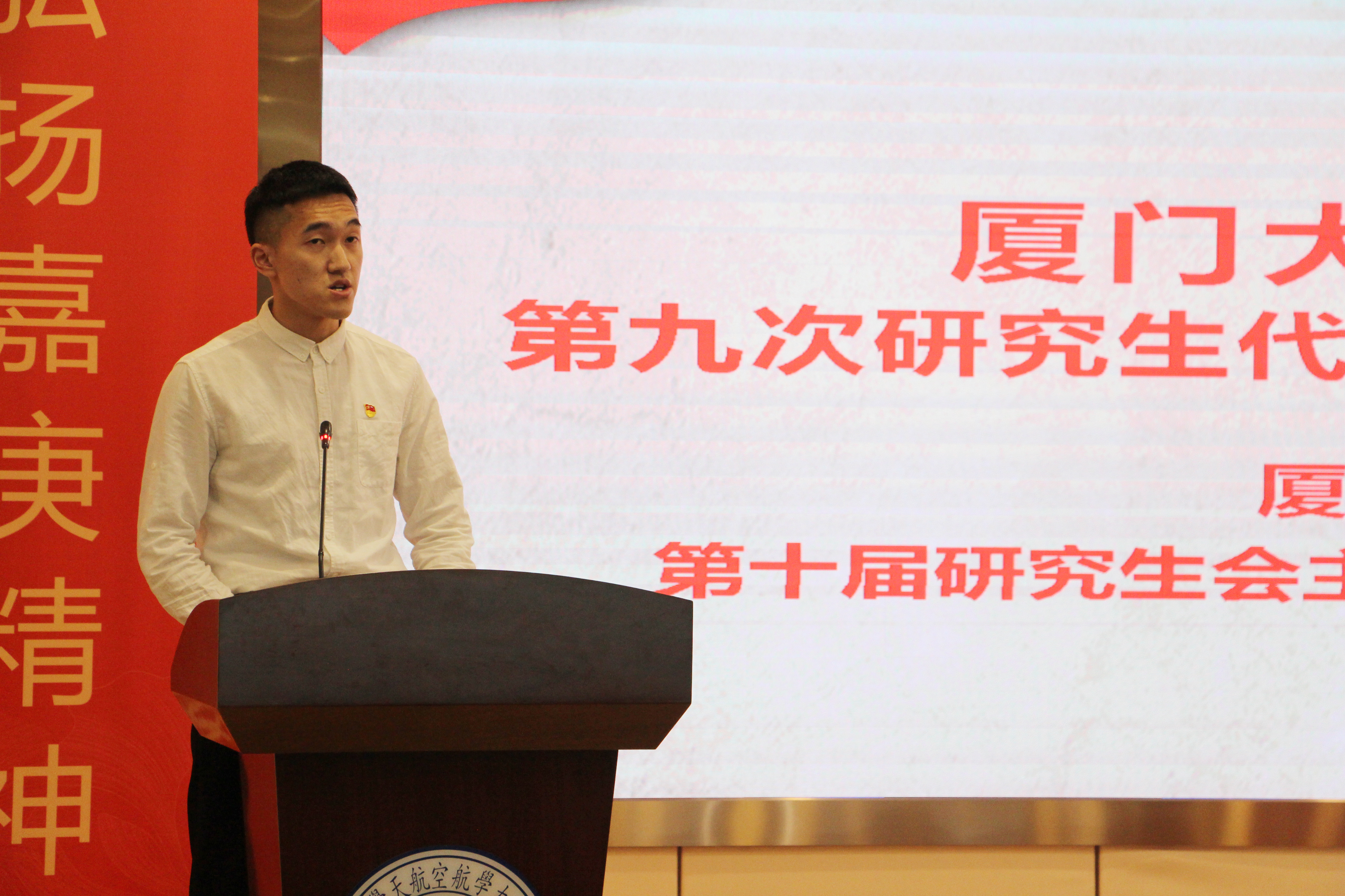 7月22日下午,航空航天学院第九次研究生代表大会暨研究生团员代表大会在院楼547报告厅顺利举行。学院党委副书记林蔚,团委书记郭江淮,团委副书记倪建超、施晨、董佳闻,学生兼职团委副书记、辅导员于波,校研究生会主席团成员刘阳以及信息学院、能源学院、萨本栋微米纳米科学技术研究院、电子科学与技术学院、生命科学学院、药学院、医学院、海洋与地球学院、环境与生态学院等兄弟学院研究生会主席团成员,学院各年级研究生代表出席大会。大会由学院学生兼职团委副书记张思韫主持。