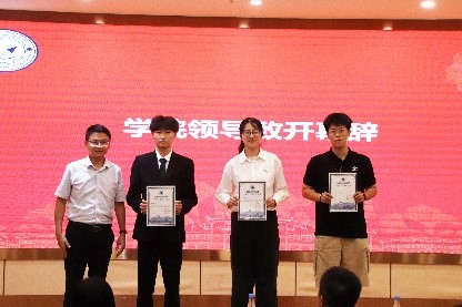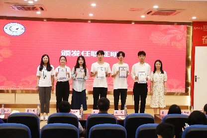 郭江淮、施晨、董佳闻、林威丞、董芬分别为学院第九届学生会及本科团总支工作人员颁发任职证明并合影留念 。