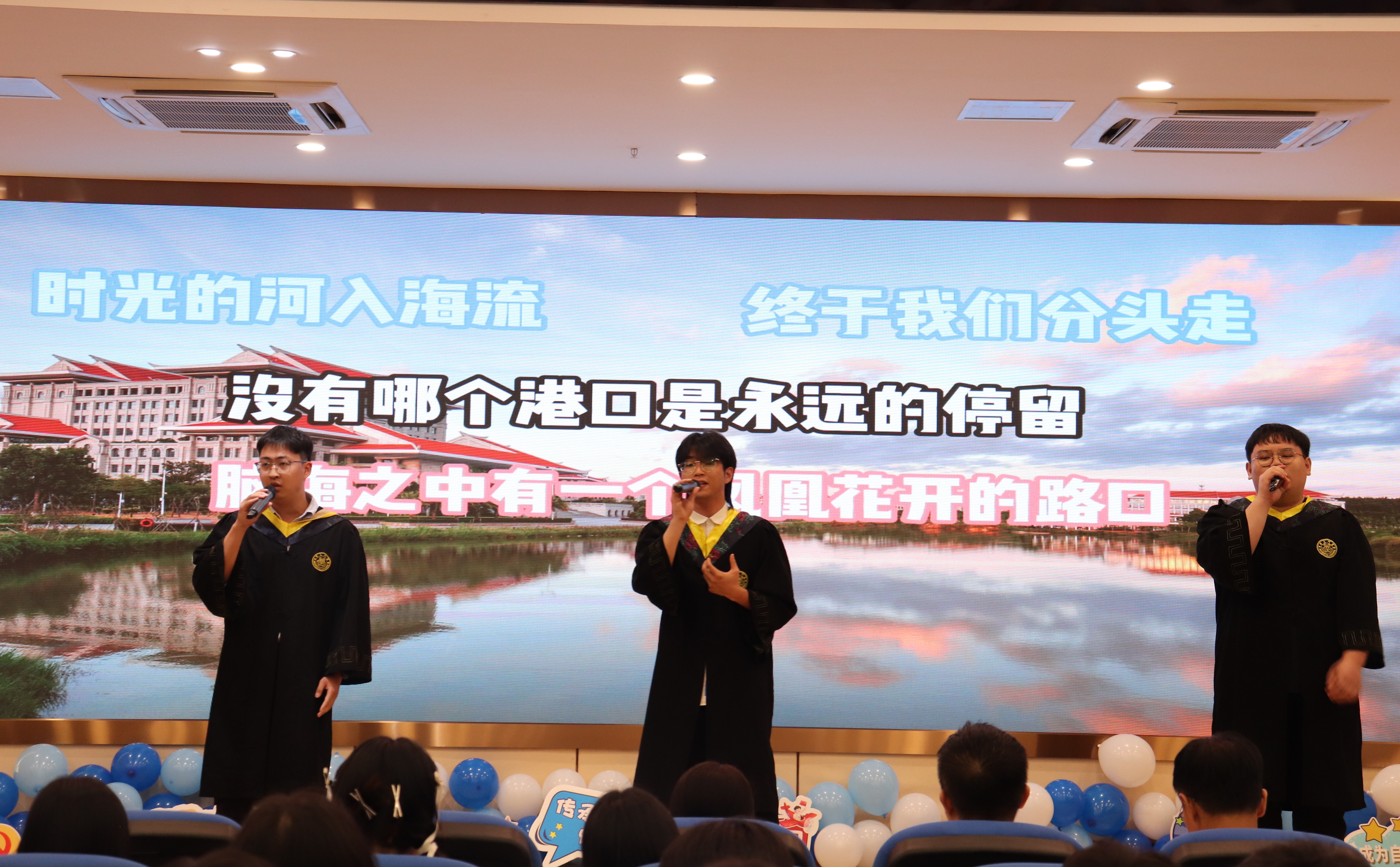 典礼最后,在场师生共同观看了由毕业生自编自导自演的毕业微电影《幸福笔记本》,随后3位毕业生代表倾情领唱《凤凰花开的路口》,将典礼的气氛推向高潮。