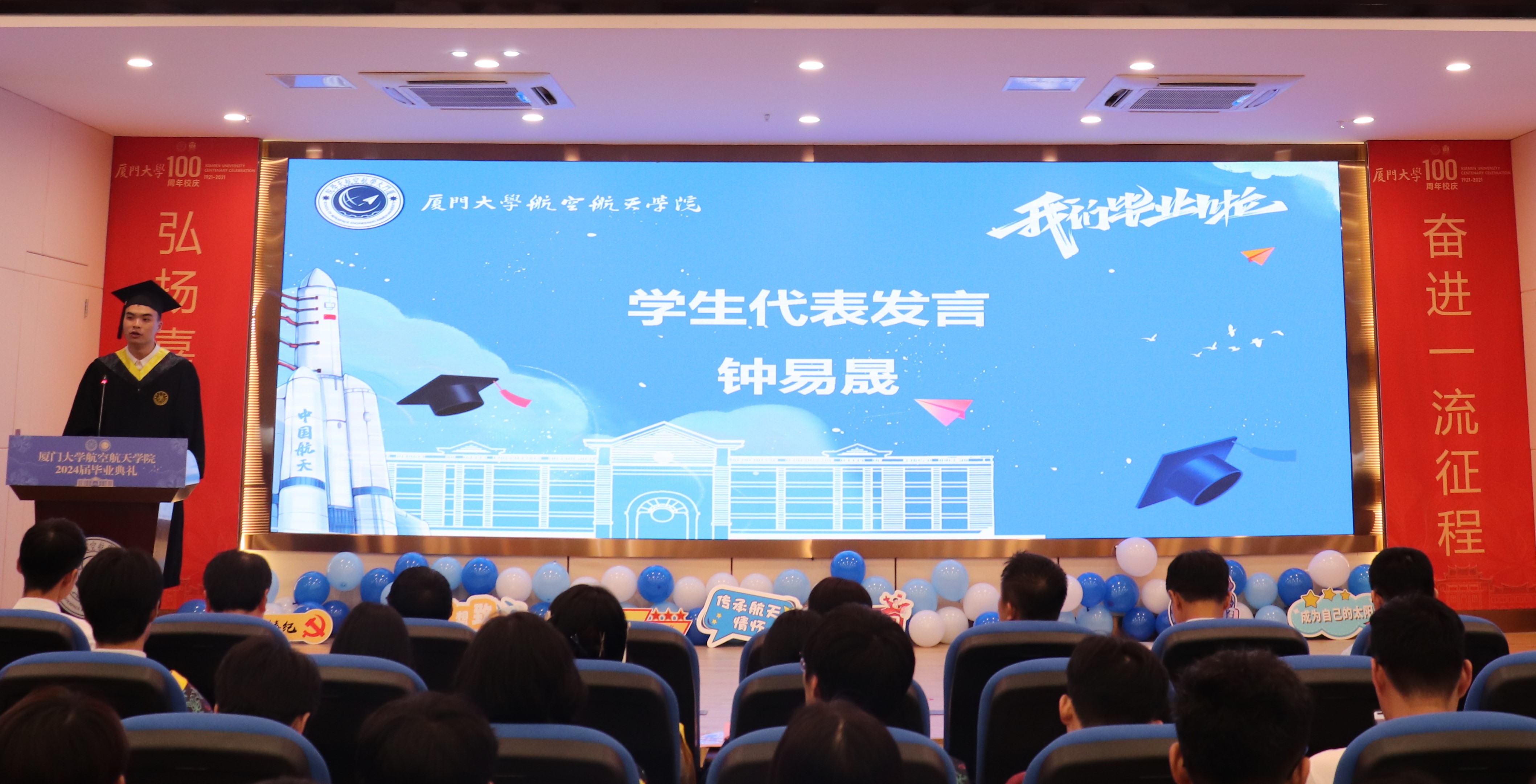 钟易晟、郭小暄和林智乐分别作为2024届本、硕、博毕业生代表发言。他们深情回顾了在厦园求学、努力拼搏的难忘时光,并对学院给予的支持与帮助、对师长的谆谆教诲与亲切关怀表示由衷的感谢。他们共同向航空航天学院2024届毕业生发出倡议,要秉承“自强不息,止于至善”的校训精神,坚定报国信心,将理想抱负与“空天梦”“强国梦”有机结合,为实现中华民族伟大复兴贡献青春力量。