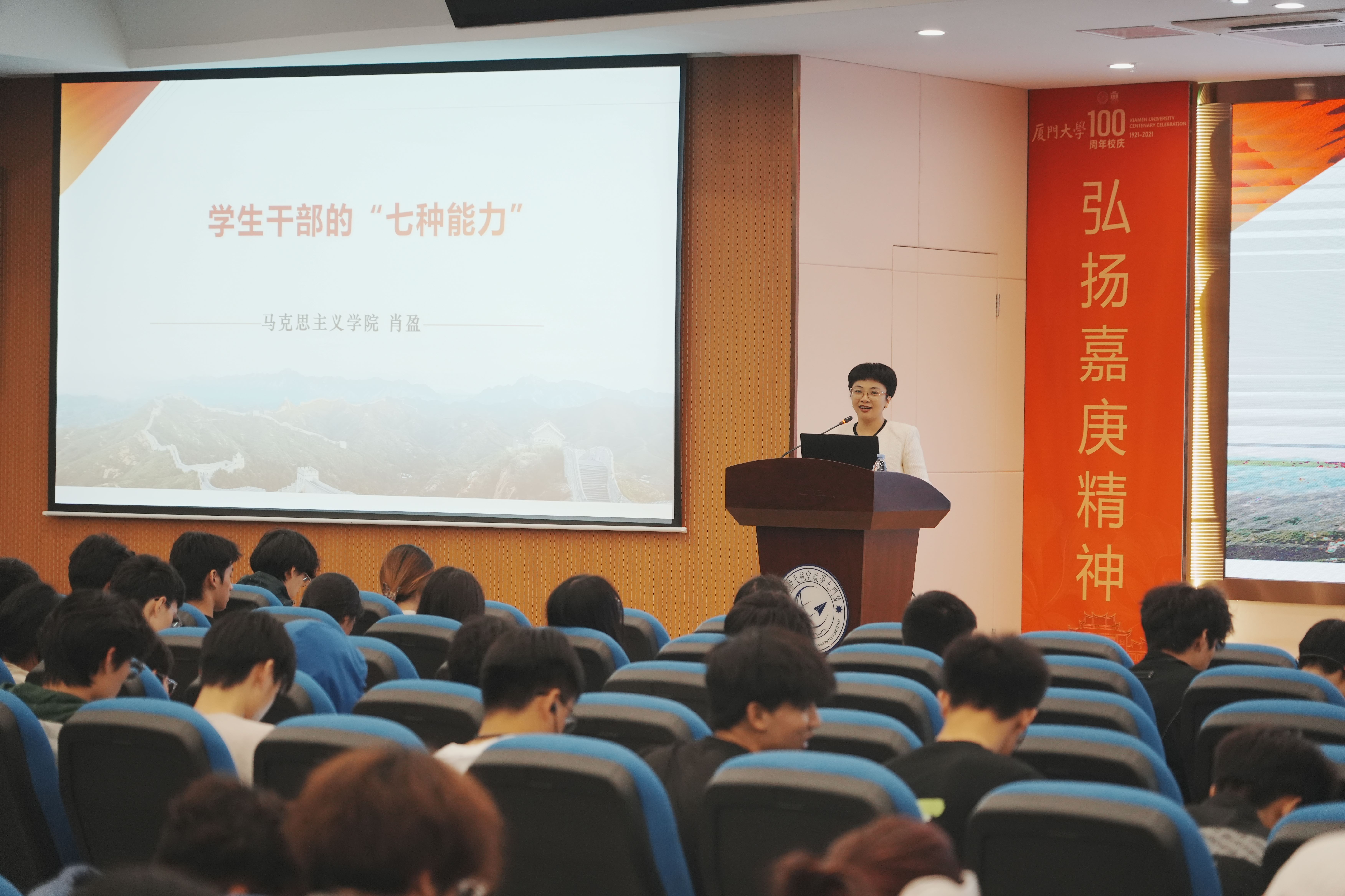 马克思主义学院副教授肖盈作“学生干部的‘七种能力’”专题报告。肖盈从学生骨干应具备的“七种能力”谈起,提出由“扫描”到“提升”再到“组合”的模式帮助学生骨干提升能力,并希望学生骨干要积极挑大梁、担重任,传承航天精神,讲好航天故事,为我国实现高水平科技自立自强再立新功。