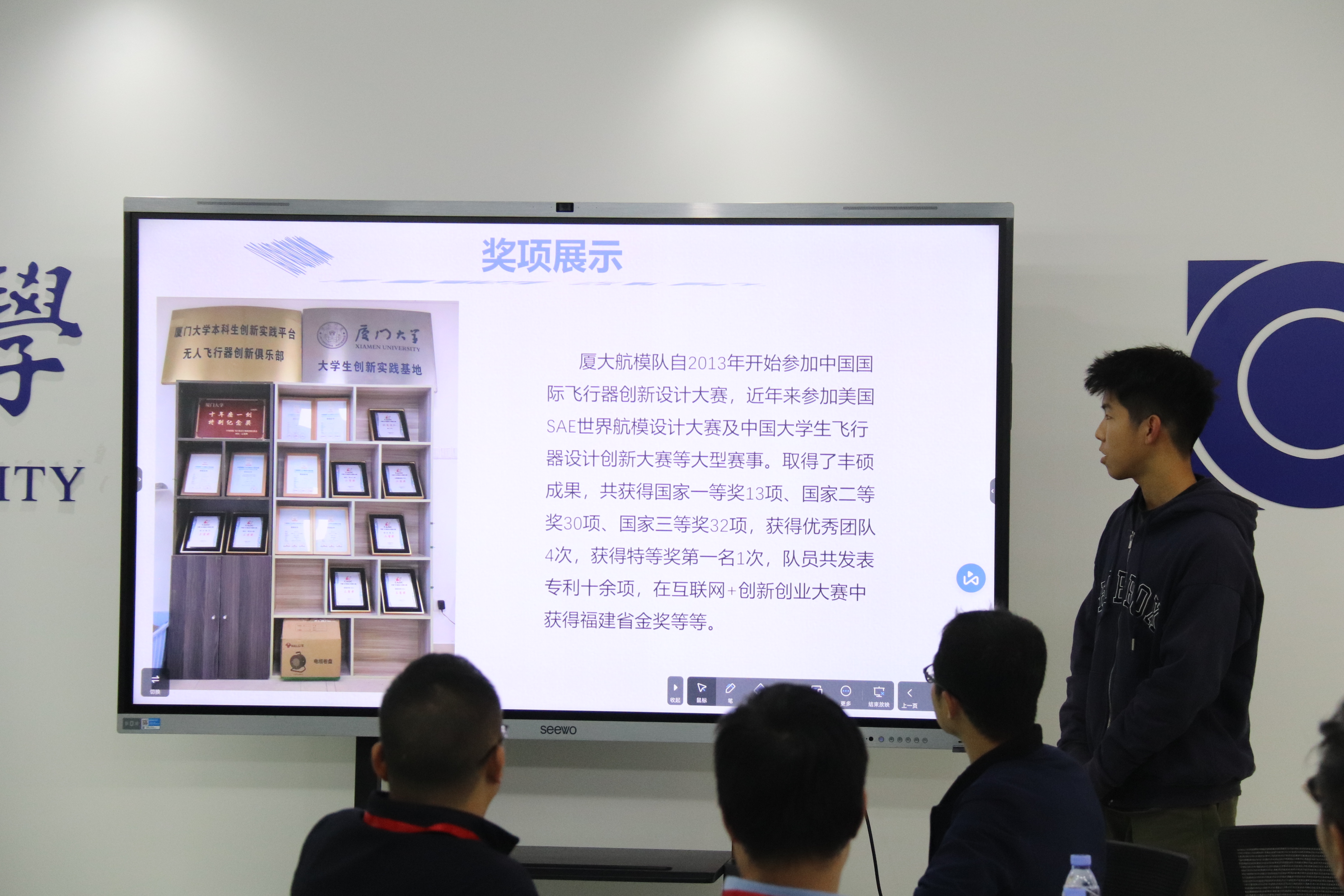 厦门大学航模队队长蔡一鸣介绍了航模队的运行模式与日常训练内容,展示了航模队自创建以来不断突破、追求卓越的成长过程,并从气动外形设计以及飞行器结构等方面介绍了航模队的技术体系与发展方向。
