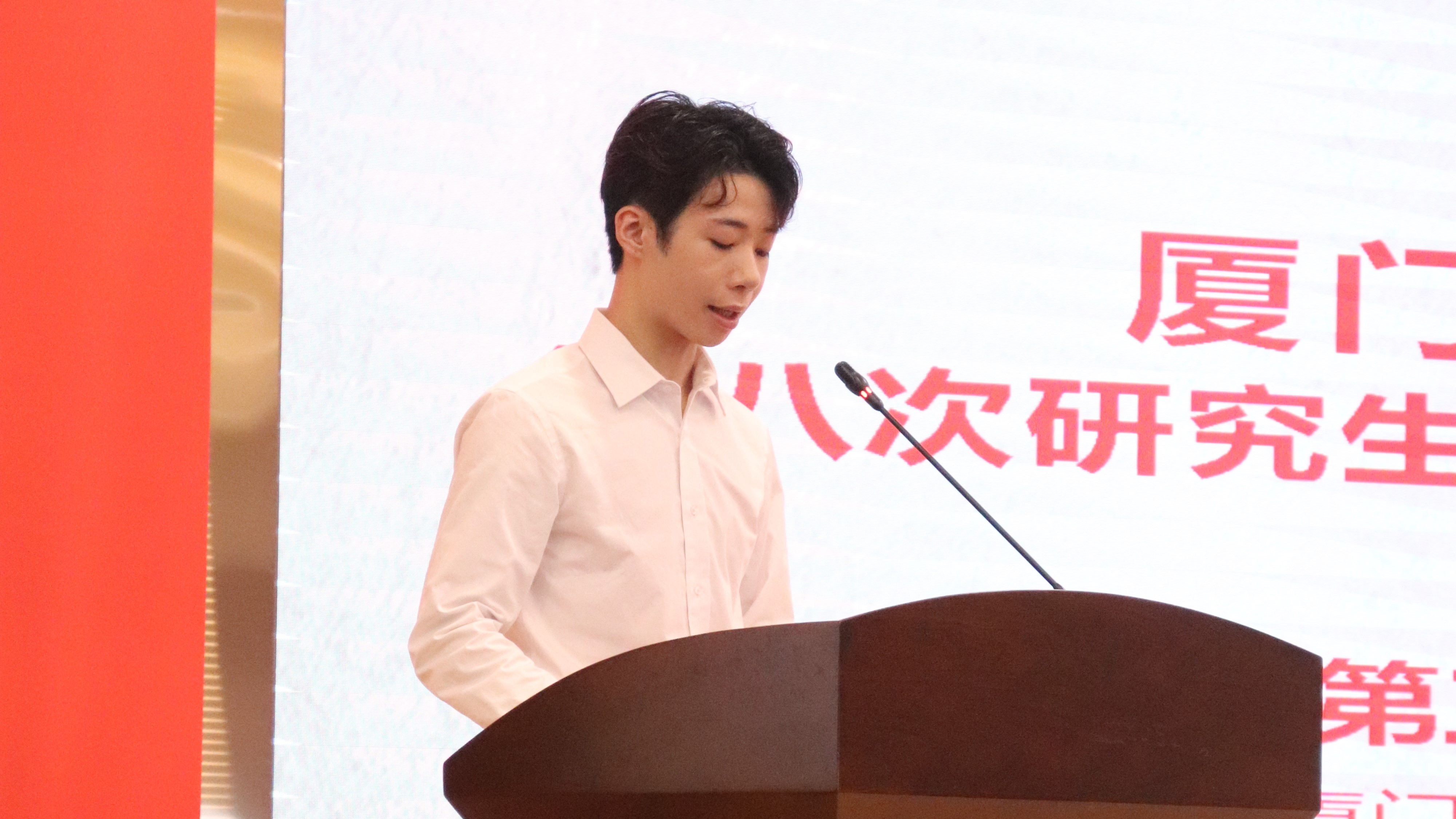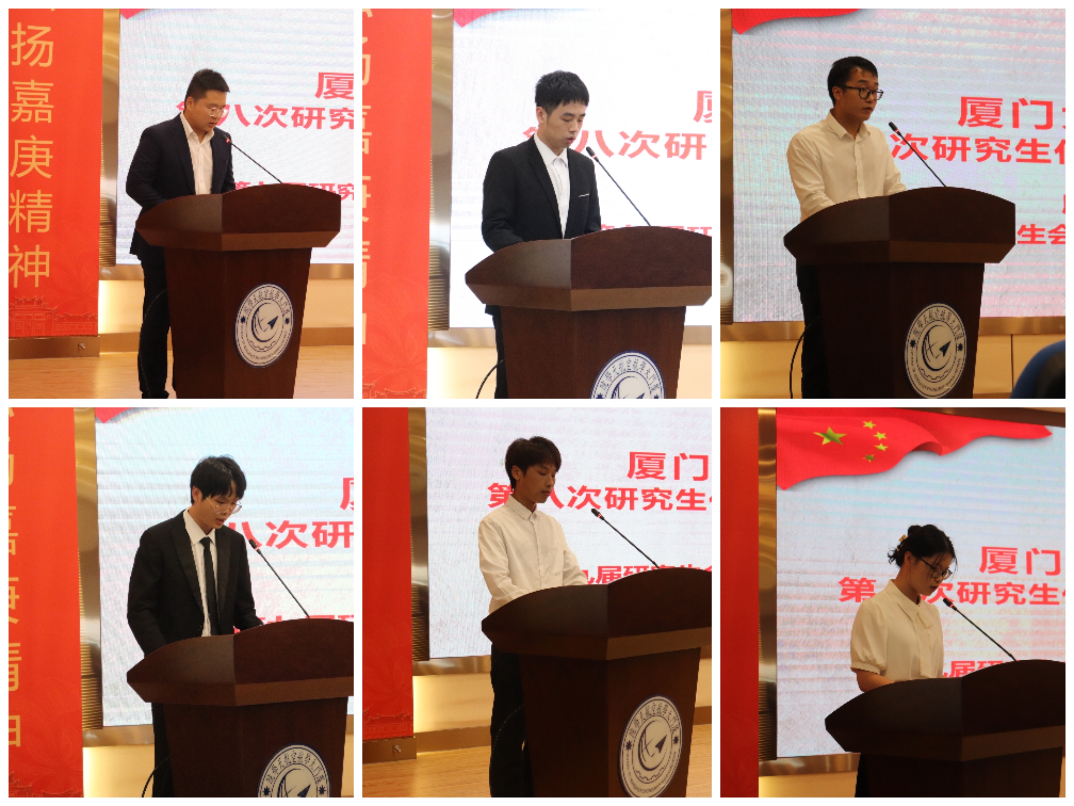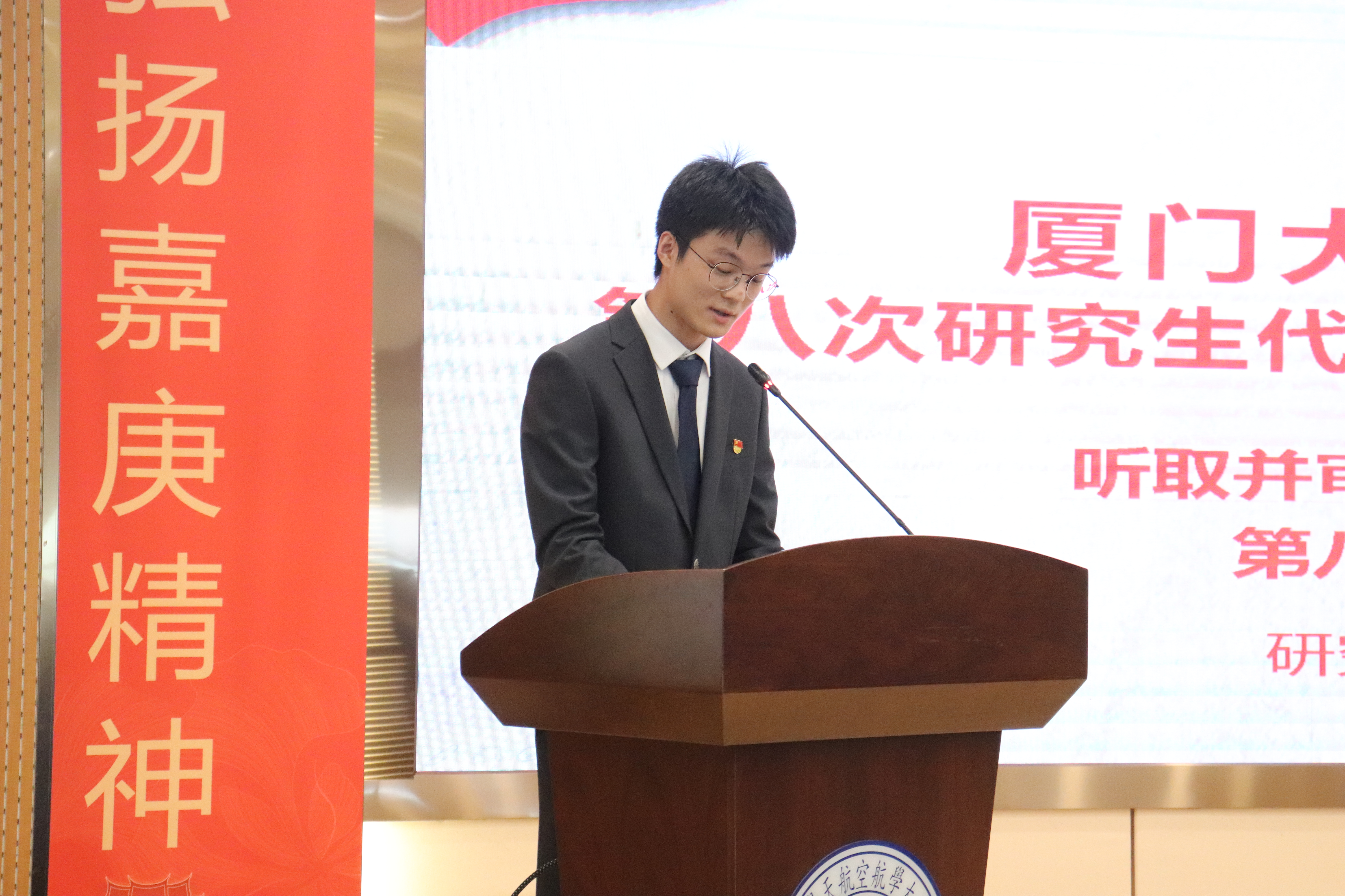 厦门大学第三十三届研究生会主席团成员吴克敏宣读厦门大学研究生会贺信。校研究生会充分肯定了航院研究生会在过去一年所开展的工作,并希望新一届研究生会能时刻牢记“全心全意服务同学”的宗旨,奋力开拓创新,引导同学们感悟习近平总书记对广大青年的谆谆教诲,肩负新时代的光荣使命,在为中国式现代化挺膺担当的新征程中唱响绚丽青春之歌。