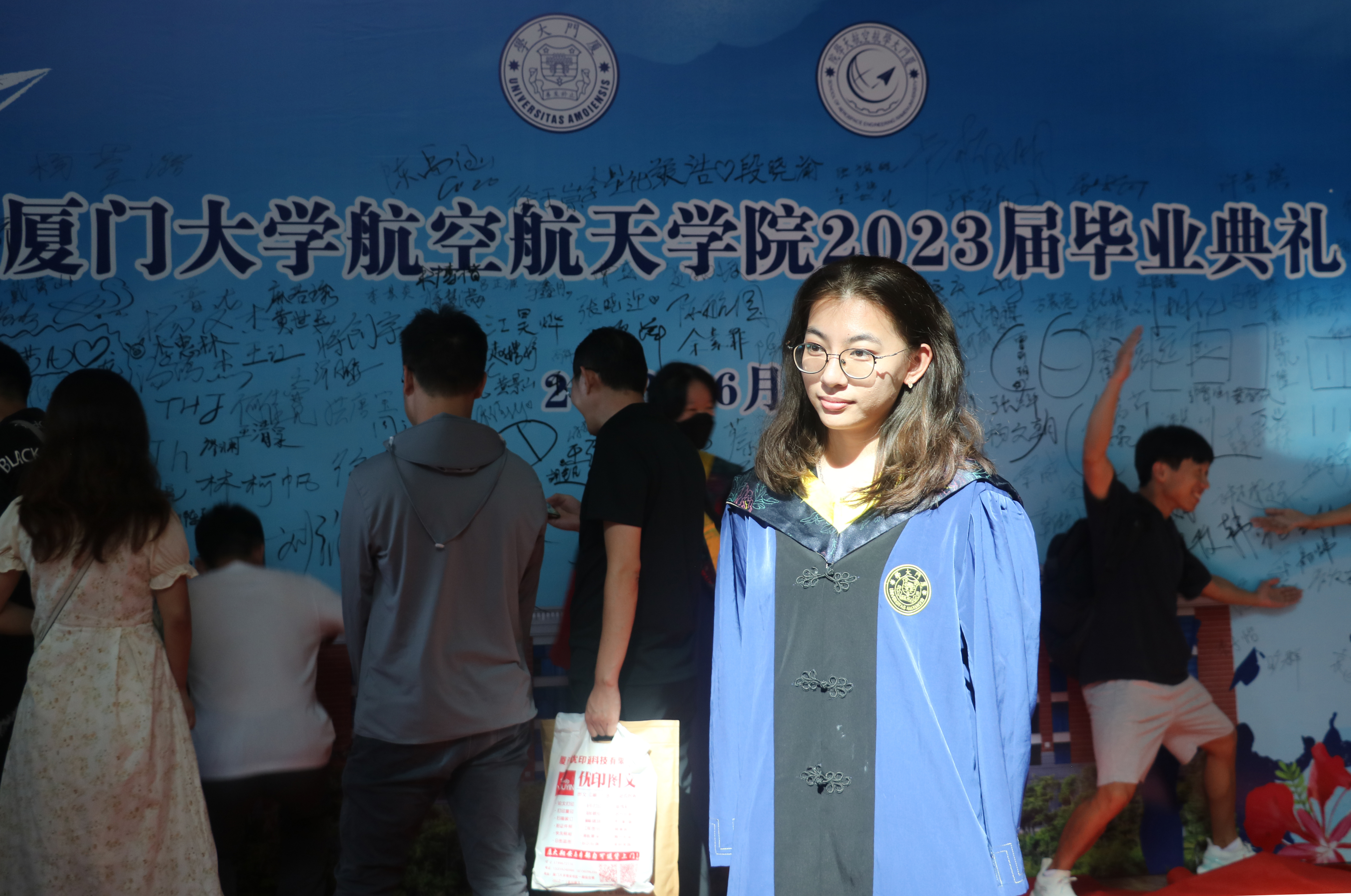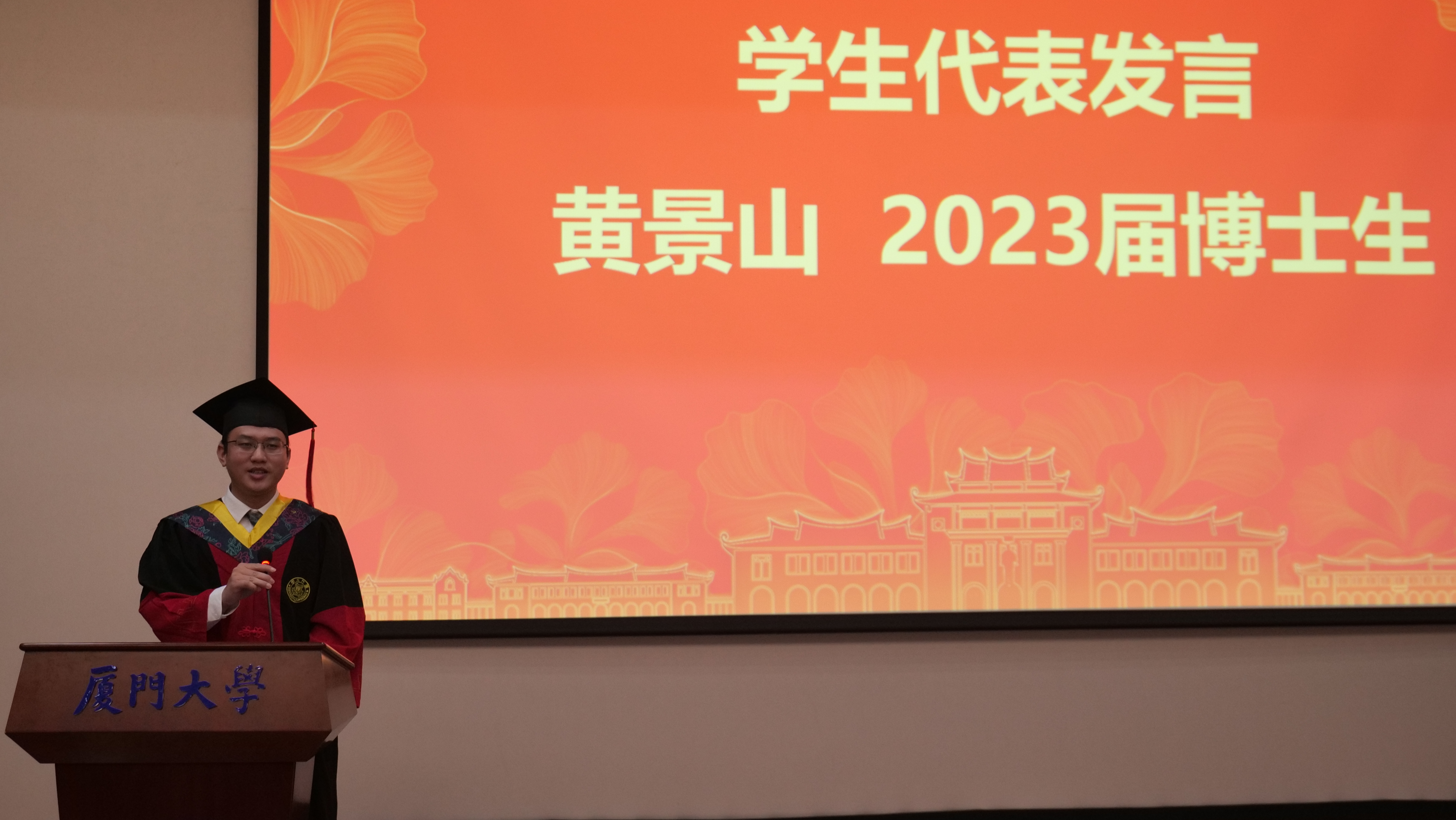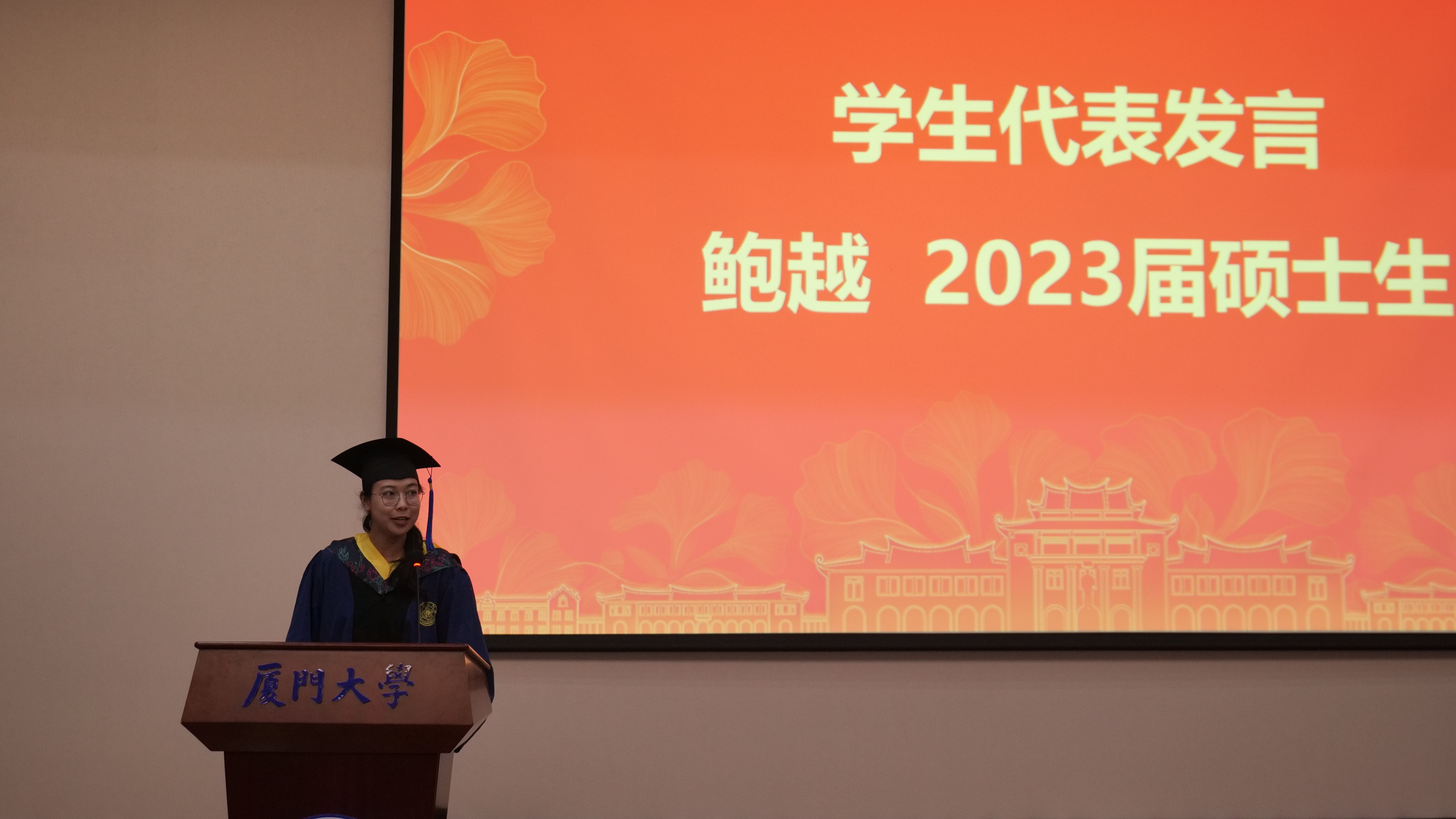 2023届毕业生代表黄景山、鲍越、郭潇玥依次发言,回忆了在厦园求学、努力拼搏的难忘时光,并对学院给予的支持与帮助,尤其是优质的科研平台、丰富的学术资源和创新的竞赛氛围表示感谢。他们也向全体航院毕业生发出倡议,要秉承“自强不息,止于至善”的校训精神,把小我融入大我,将理想抱负与“空天梦”“强国梦”有机结合,为实现中华民族伟大复兴贡献青春力量。