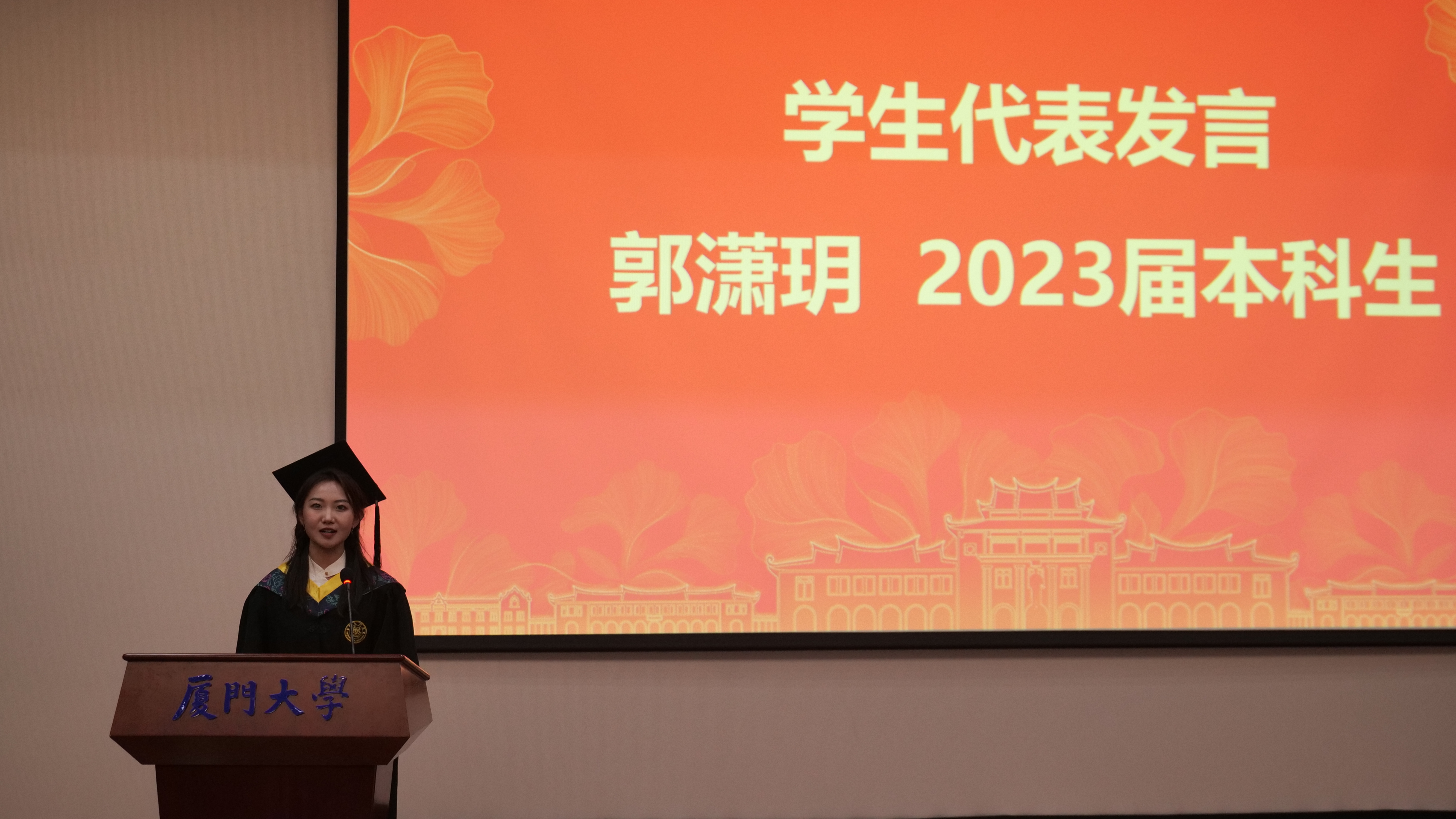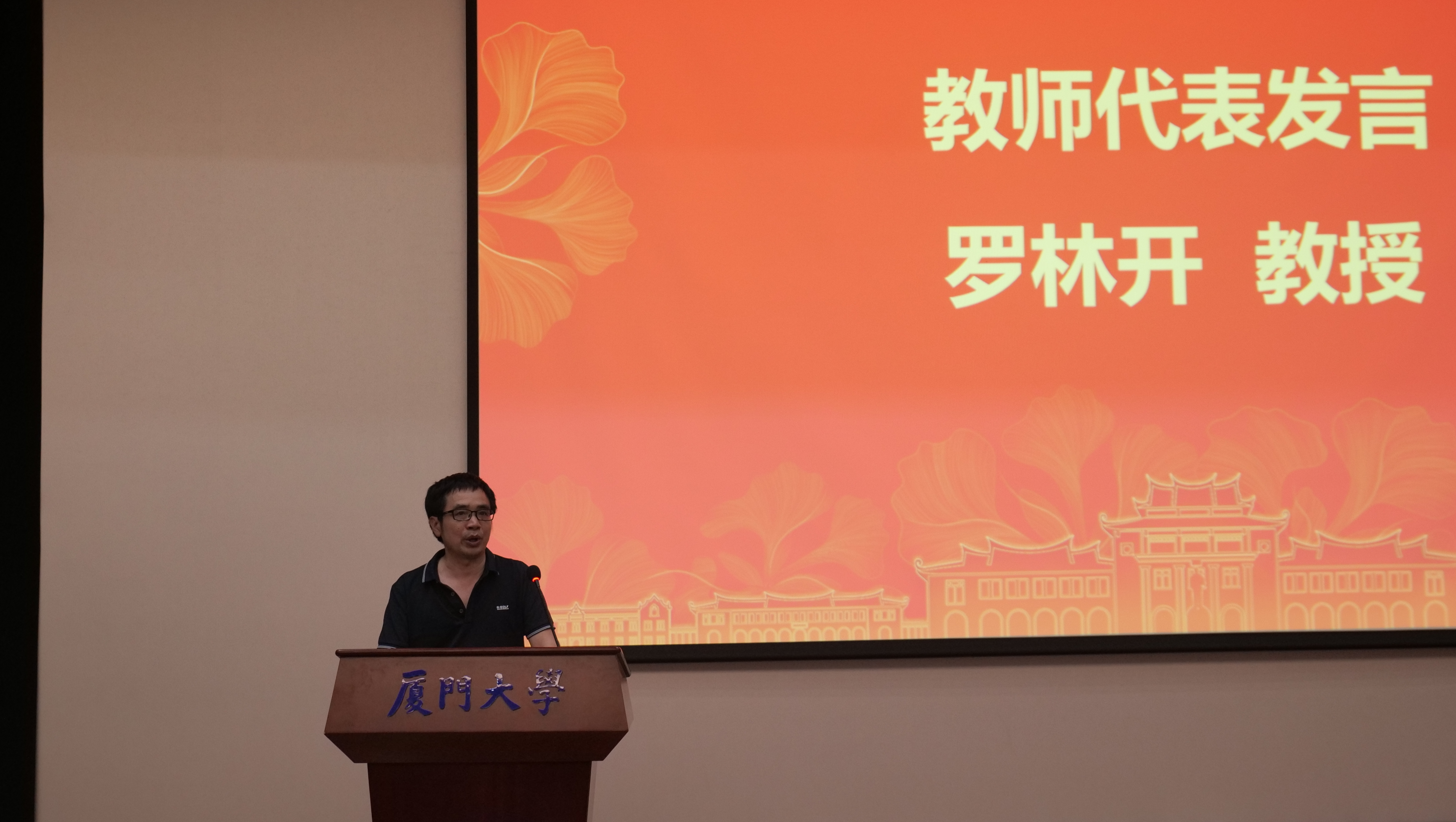 随后,获评厦门大学2022年“我最喜爱的十位老师”的罗林开教授作为教师代表发言,希望毕业生们在今后学习、生活、工作中要做到扎实做事,掌握相关知识和方法,面对问题时要踏实处理,不求虚名而求实际结果;要做到与人相处时,多替对方考虑,多借鉴他人的经验;要做到学会解压,在面对压力、负面情绪时,要积极寻求帮助与支持,排解压力。
