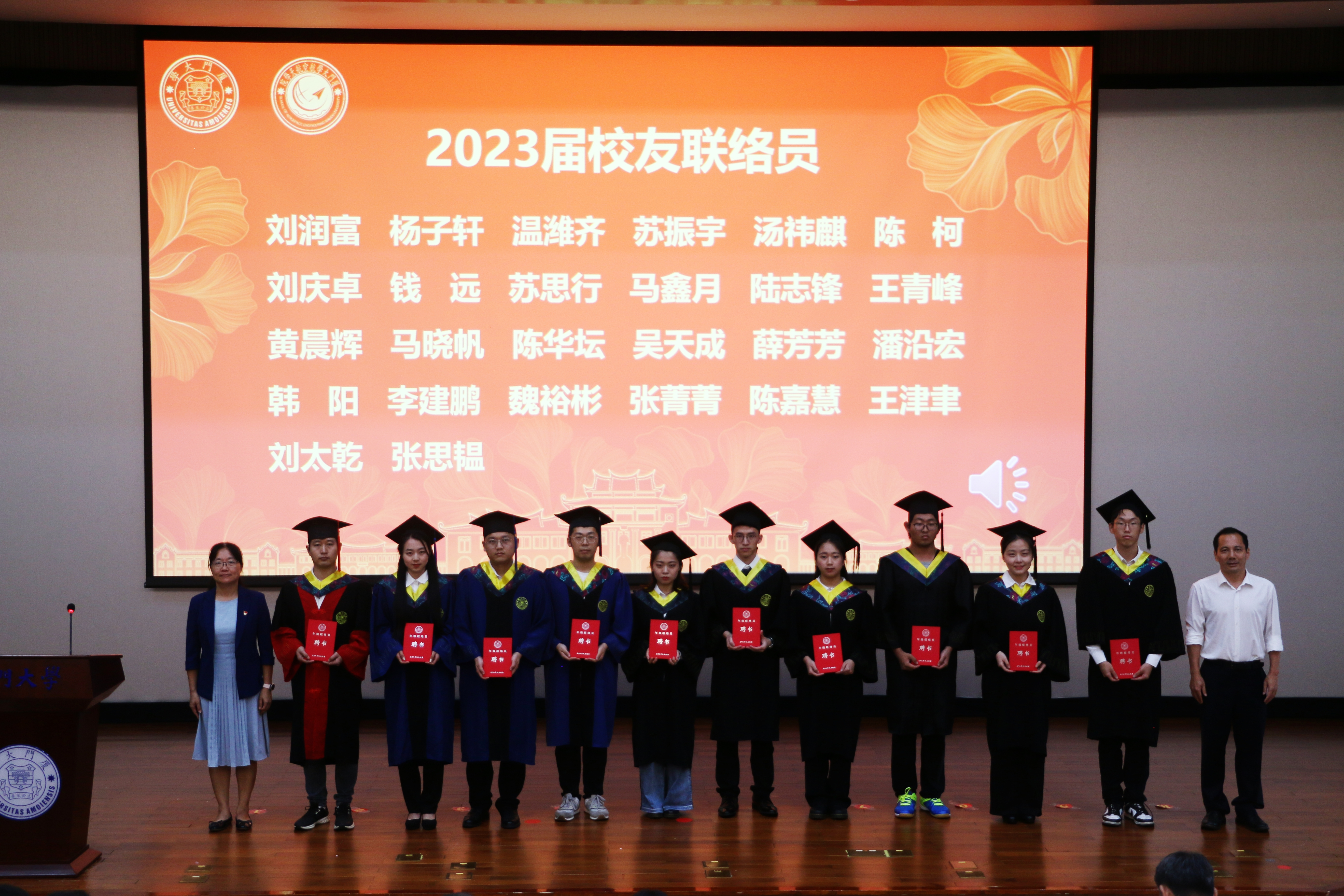 “今天我以母校为荣,明天母校以我为荣”。为加强毕业生与校院的联络,典礼上举行了2023届校友联络员聘任仪式,林蔚、卿新林为他们颁发聘书。