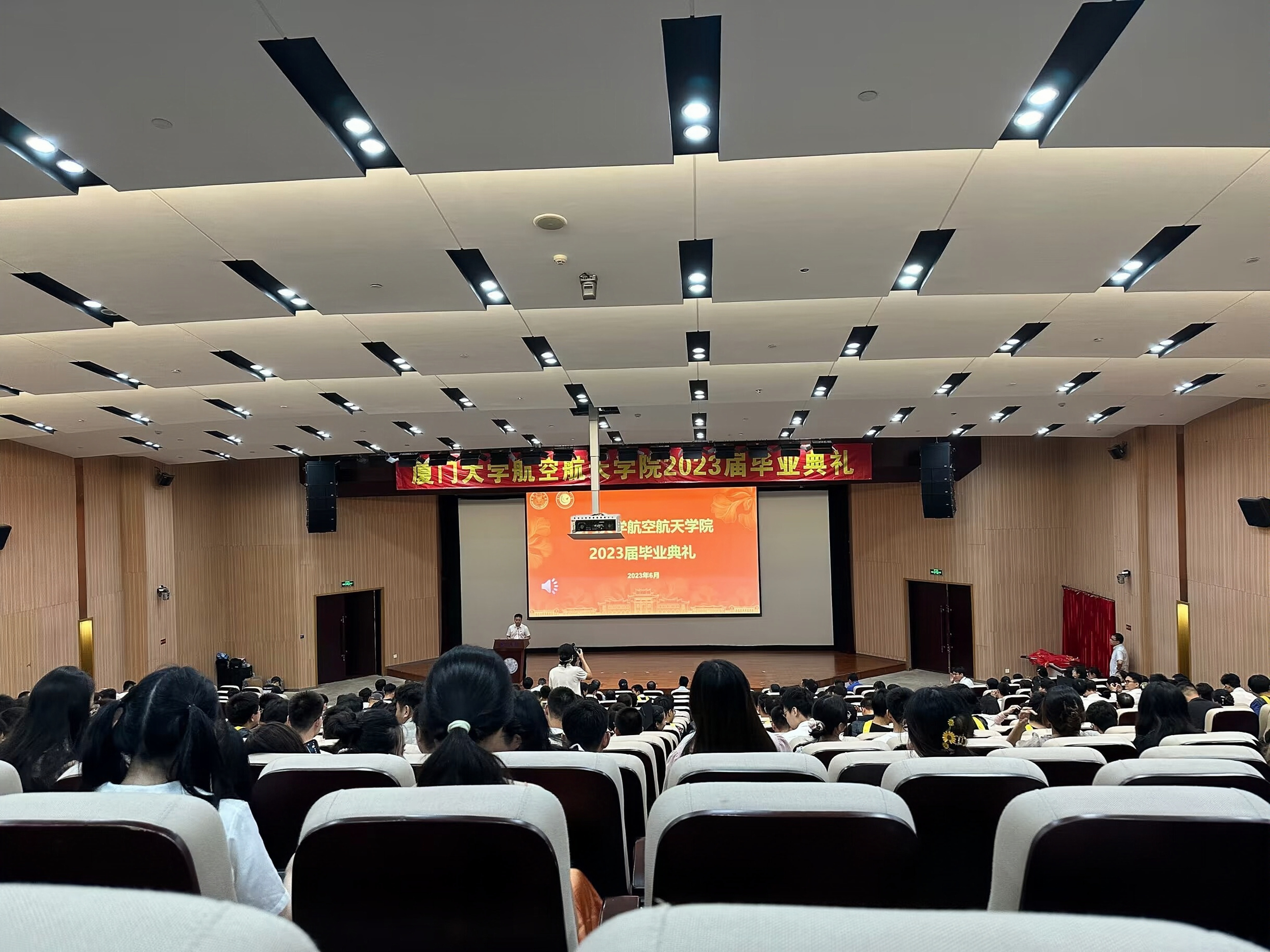 凤凰花开,骊歌唱响。6月19日下午,航空航天学院“情系寰宇·逐梦远航”2023届毕业典礼在德旺图书馆一号报告厅隆重举行。学院党委书记廖志丹,常务副院长、党委副书记尤延铖,副院长卿新林,党委副书记林蔚,党委委员黄玥,及各系负责人、教师代表、全体辅导员、2023届全体毕业生和部分学生家长参加典礼。典礼由学院党委副书记王寒主持。