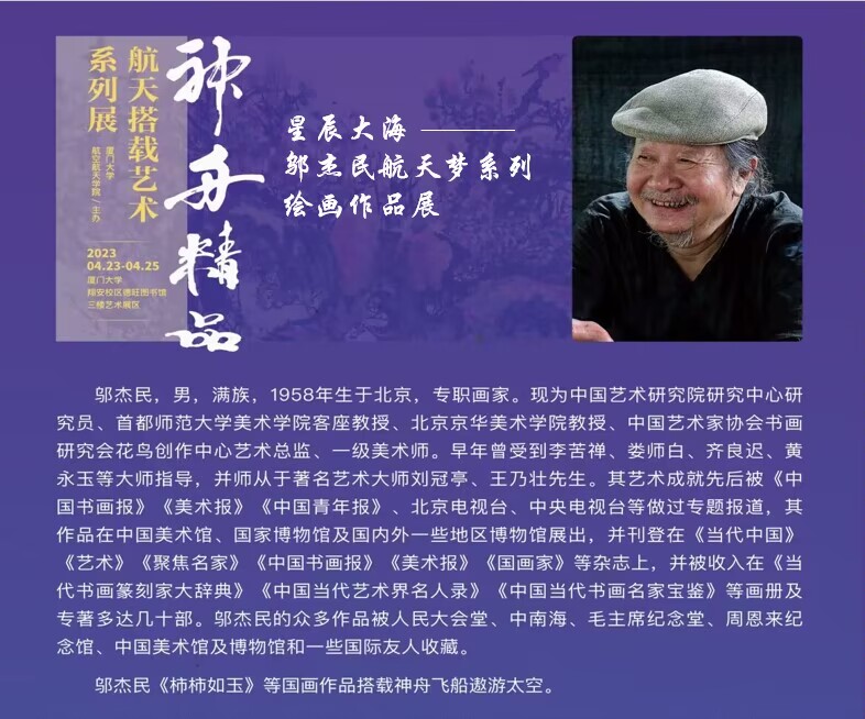 邬杰民老师的《和贵图》、《惠风和畅》、《万寿同春》、《秋实》、《寿而康》等多部画作曾搭乘神舟号载人飞船遨游太空。此次画展分为 “盛世欢歌”、“飞天梦圆”、“天人合一”和“星辰大海”四个部分,主要表达航天与绘画、航天与书法等艺术的高度融合和珠联璧合,体现中华民族从古至今对于浩瀚星辰的不懈探索。观展师生不仅近距离感受了书画作品之精,品鉴了艺术之雅,浸润心灵及对美的理解,也更加向往浩渺宇宙苍穹,期待“上九天揽月、入银河摘星”。