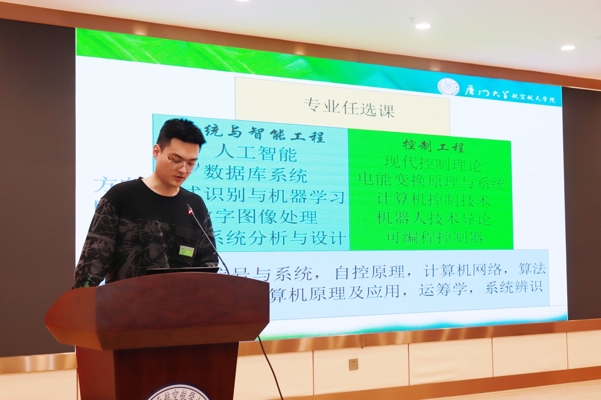 优秀学生代表分享环节,自动化系2019级本科生庄少彬向大家分享了自动化系的基本情况,包括自动化系的发展历史与特色、课程内容、就业前景、研究方向、科研途径等。他指出,自动化是集控制科学、系统科学、信息科学和计算机科学于一体的极其活跃的具有广阔应用领域的学科,学习基础覆盖多个层面,工作去向涵盖自动化、计算机、系统工程、电子商务、金融等领域。