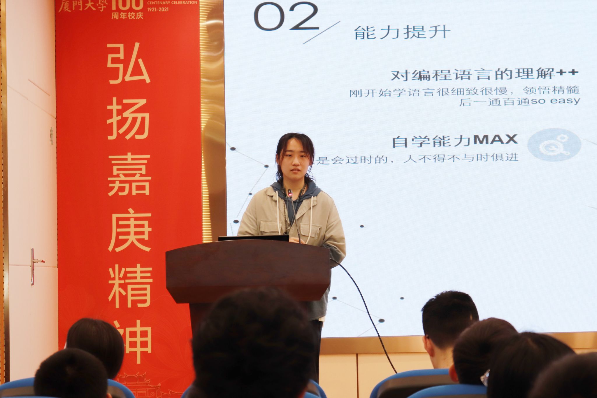 自动化系2019级本科生杨宏芷宁结合个人学习经历和专业选择心路历程,分享了她对自动化系课程内容、能力提升、深造保研等方面的认识。她表示,自动化系对提升大家编程语言、数据、控制等方向的理解具有较强适用性,进入自动化系也将收获强烈的成就感。