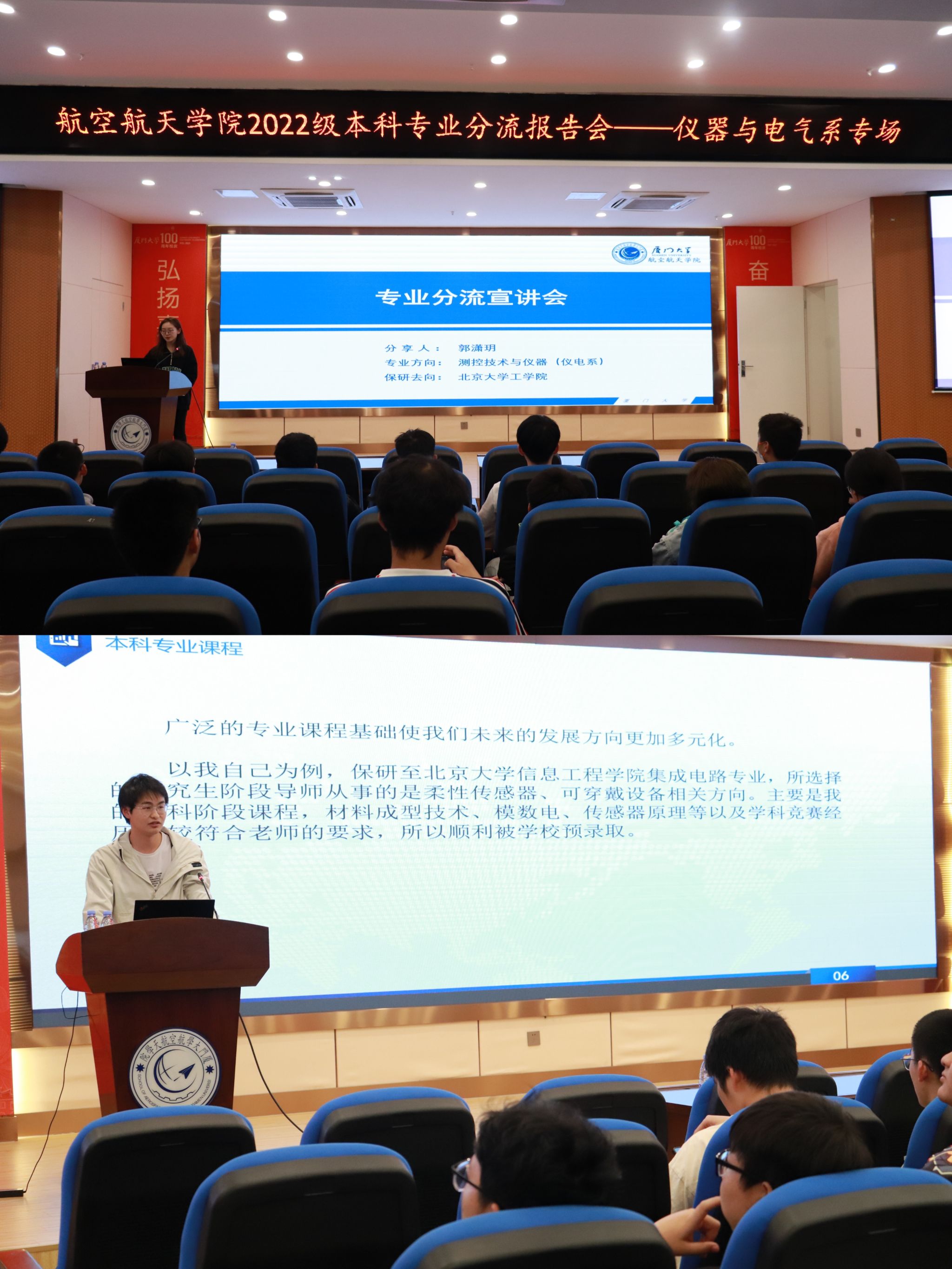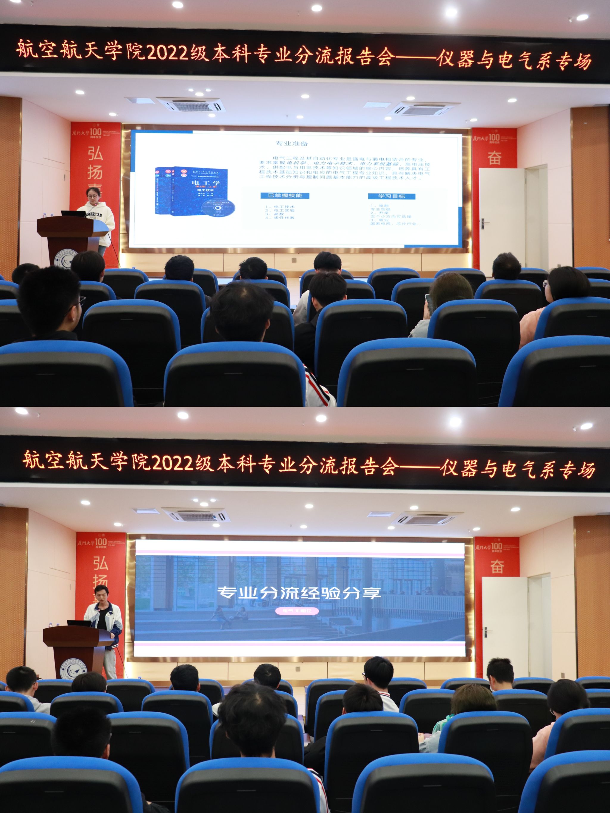 为进一步提升本科一年级同学对于航空航天学院各本科专业的认识,强化专业认同并更好地规划学业生涯和选择分流专业,学院团委联合仪器与电气系于2023年4月7日在院楼547报告厅举办2022级本科专业分流报告会。仪器与电气系系主任王奕首教授、辅导员董芬、仪器与电气系的优秀学生代表及2022级本科生参加。