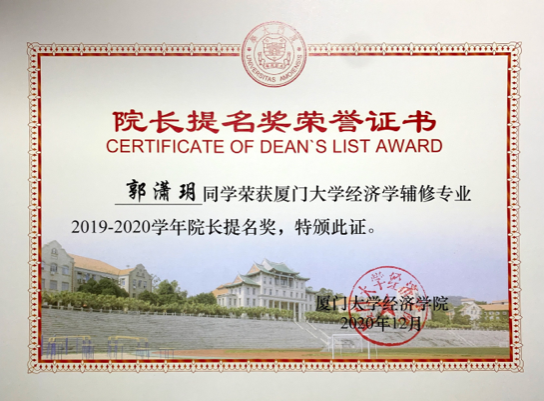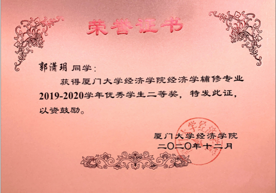 在学习上她一丝不苟,认真严谨是她对待学习的态度。她总是不满足于现状,专注于将自己的专业知识学到极致。她是图书馆的常客,有时经常一待就是一整天,满满当当的to do list是她每日为自己定下的目标。三年的专业课学习她从未懈怠,除了主修测控技术与仪器专业外,为扩展学科兴趣,她还辅修了经济学,主修、辅修成绩均名列前茅。主修专业前三年综合排名专业第一,辅修专业也以优异的成绩获得了经济学辅修专业院长提名奖、优秀学生二等奖学金。