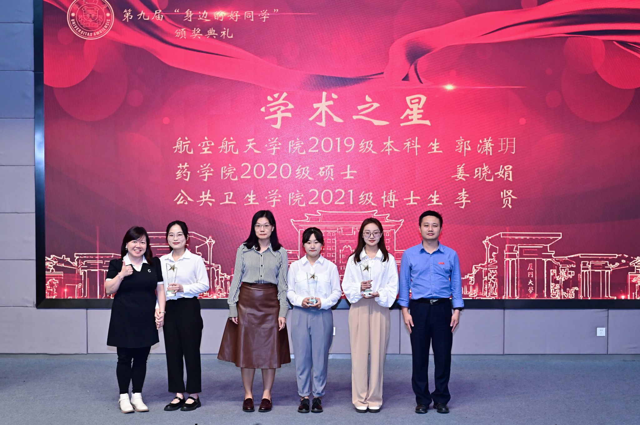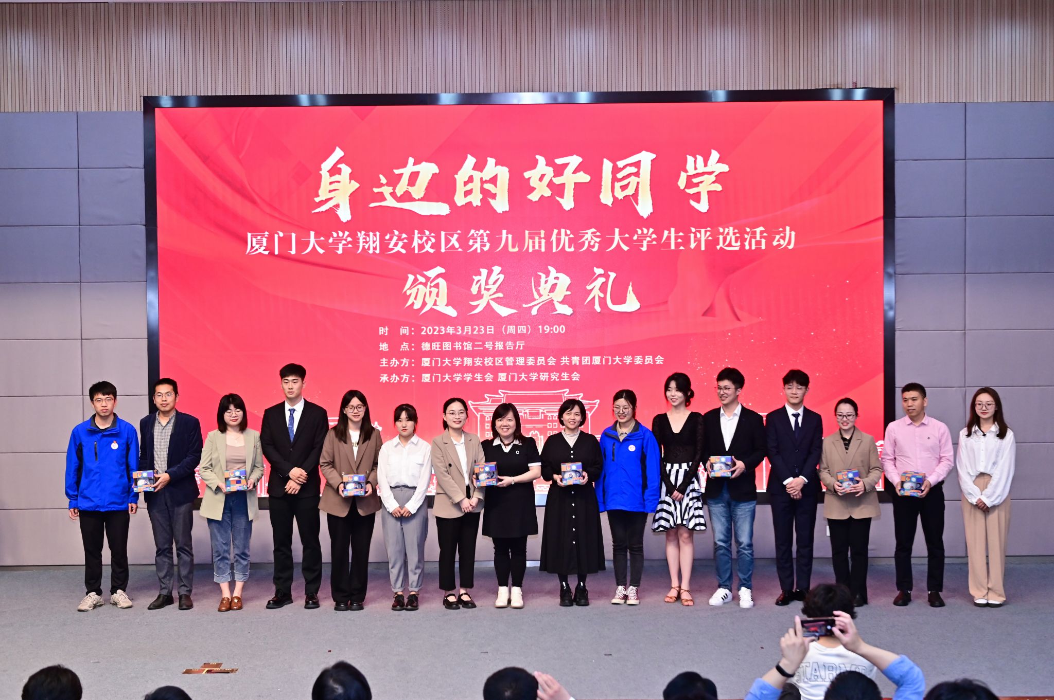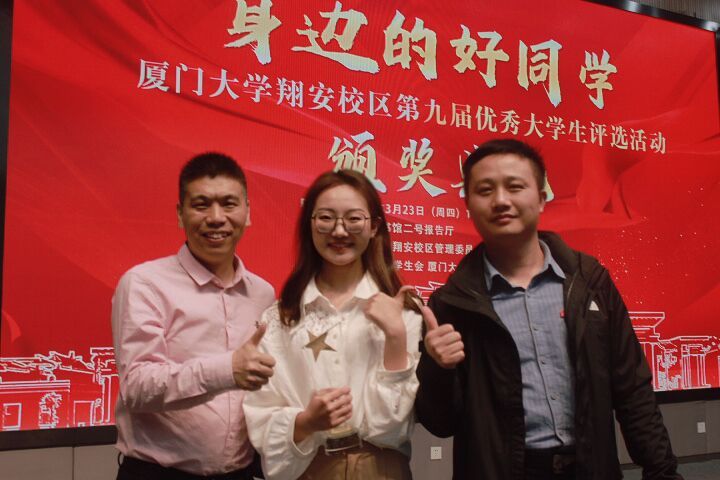 为深入学习贯彻习近平新时代中国特色社会主义思想和党的二十大精神,落实立德树人根本任务,厦门大学翔安校区管理委员会、共青团厦门大学委员会联合举办厦门大学翔安校区第九届优秀大学生评选活动。翔安校区管委会副主任马龙、翔安校区学生办主任高斌等出席3月23日晚举办的颁奖典礼。学院党委副书记王寒为郭潇玥颁发“学术之星”奖杯,教育培训中心副主任(主持工作)刘万山作为该生指导教师参加本次活动。