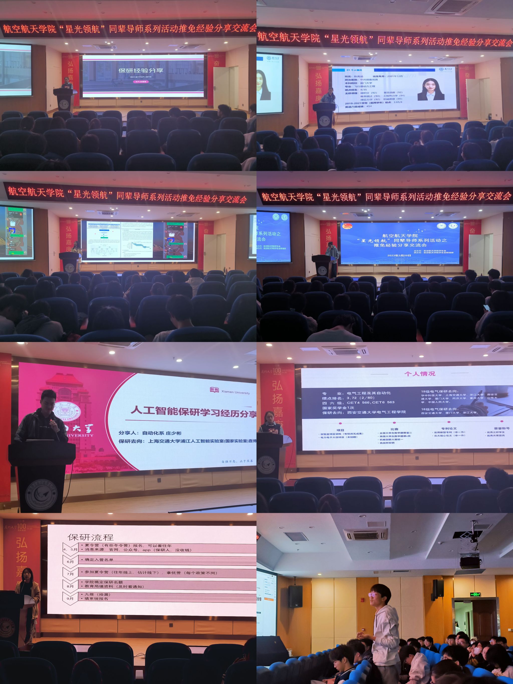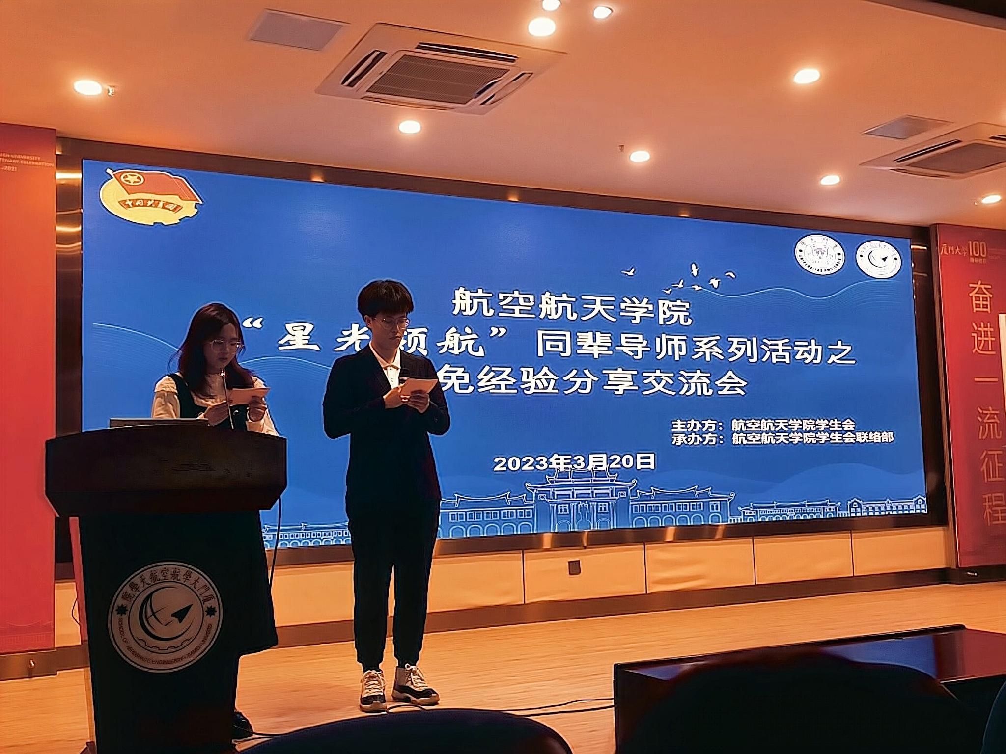 为加强优良学风建设,发挥优秀学生的示范作用,3月20日下午,航空航天学院在院楼547报告厅举行“星光领航”学业朋辈导师系列活动之推免经验分享交流会,本次活动由院学生会主办,学生会联络部承办,共有200余名学生参加。