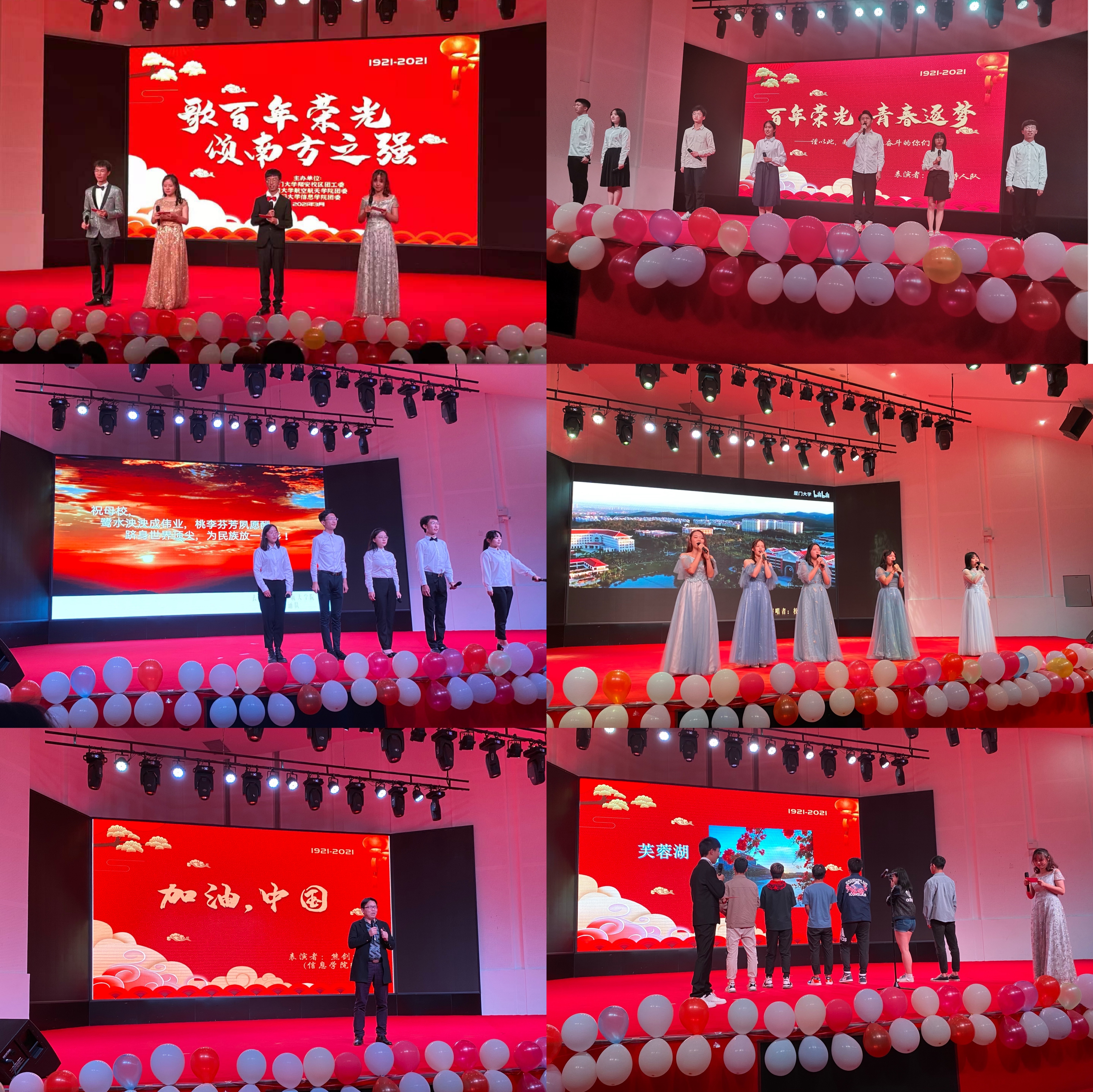 活动以一场活力舞蹈拉开帷幕,为母校百年校庆增添青春活力。整场活动分“忆往昔峥嵘岁月”、“颂当今百年盛世”、“追来者蓬勃潮头”三个篇章,以动听的歌曲、恢弘的朗诵展现了大学生从迷茫、探索到最终明确目标,为之努力奋斗的心路历程,来自校学生艺术团翔安校区分团、航空航天学院、信息学院、环境与生态学院、医学院、药学院、启风话剧社的节目精彩纷呈,每段旋律和诗词里都凝聚了翔安校区学子们对厦大的浓浓深情。航空航天学院主持朗诵队精心演绎的《南强华诞颂》主题朗诵将活动氛围推向了高潮,全场师生齐祝“母校鹭水泱泱成伟业,桃李芬芳夙愿酬!”