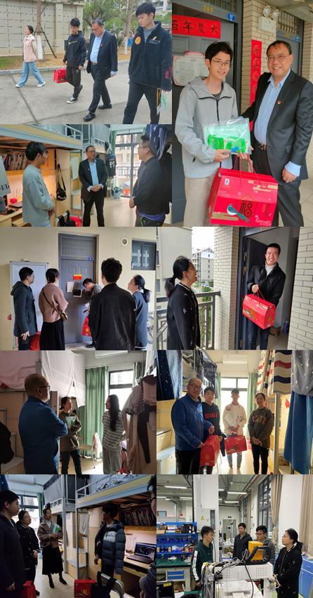 在学生宿舍,王康平与留校同学们进行了亲切交流,关心他们的在校生活情况,并致以新春的问候祝福,祝愿大家在学校过平安年、快乐年、幸福年;张晴向留校同学们了解留校安排,嘱咐他们通过多种方式问候家人,并鼓励大家积极参加学校、学院精心组织的寒假新春活动,度过一个祥和温馨的假期;林蔚叮嘱留校同学们注意保暖,加强假期锻炼、注重身体健康,并遵守疫情防控政策要求,新年新气象、学习更进步、家庭更幸福。学院领导和辅导员们还来到实验室,慰问参与科研工作的研究生,祝愿他们实验顺利成功,并提醒他们认真做好实验室安全工作。