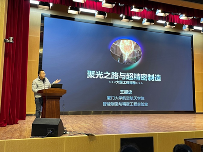 机电工程系王振忠分四部分做了授课:认识大国重器,领会其意义;着重介绍实验室简单知识;初步了解部分点火装置原理;初步探究先进光学超精密制造领域。他的课深入浅出,让同学们受益匪浅,理解了大国工程的意义。课上不仅通过多个视频将同学们较难理解的超精密制造过程以更具体可感的方式呈现,还设计了师生互动环节,激发了同学们的学习兴趣,提高了学习效率。