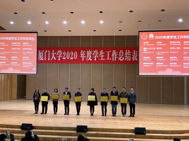 2021年1月10日,厦门大学2020年度学生工作总结表彰大会在科艺中心音乐厅召开,校党委副书记赖虹凯出席会议并讲话,校关工委主任陈力文,校党委常委、宣传部部长、教师工作部部长徐进功,校党委常委、组织部部长、统战部部长孙理等出席会议。大会总结我校2020年度学生工作的成绩和经验,并对2020年度学生工作先进单位、特色单位和优秀辅导员进行表彰。航空航天学院党委副书记张晴、林蔚,全体辅导员参加会议。