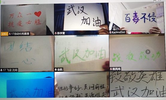 最后,随着一段由航院师生制作的《明天会更好》防疫MV的播放,团员们纷纷举起自己制作的“武汉加油”、“万众一心,战役必胜”等“爱的号码牌”。