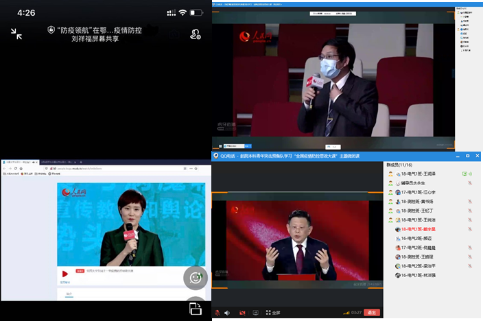“防疫领航”在鄂先锋党支部、留校学生党支部、本科青年突击预备队三支学院抗“疫”一线学生集体,自发组织全体成员观看直播,并与同学们热议学习体会。
