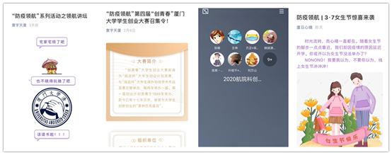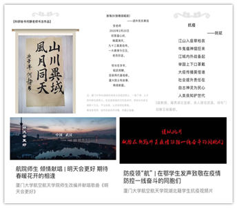 线上教学开始了,形势与政策课、心理健康教育课、毕业设计和论文辅导,热火朝天的线上讨论,隔着屏幕的大家仿佛更愿意吐露心声。“第二课堂”也随之相伴:航院学工组精心策划,第一时间推出诸多“云”活动。开展领“航”讲坛,传授考研升学经验;发布第四届“创青春”学生创业大赛召集令,举行线上指导会议,组织申报工作;实行线上就业指导,视频连线直播就业“大咖”分享会、指导制作求职简历、不间断批量推送最新招聘信息等,以解毕业生求职的“燃眉之急”。组织开展居家战“疫”之厨“疫”大比拼、防疫知识竞赛、“晨光初厦”晨读经典、线上趣味运动会、缤纷“女生节”等形式新颖的课余活动,让同学们宅家“上大学”。录制在鄂地区同学们的抗“疫”暖心视频,学院师生联合倾情改编献唱歌曲《明天会更好》,创作诗词、书法等系列艺术作品,“艺”起抗疫。思政形式在变,但效果不变。