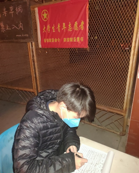 共青团员孙颖,厦门大学航空航天学院2019级本科生,来自安徽省宣城市宁国市。自疫情暴发以来,她积极响应社区号召,成为疫情防控大学生青年志愿者团体中的一份子。随着疫情逐渐得到大家重视,村委会开始对村口进行管理,每日安排志愿者在路口站岗。作为志愿者的她,需要从早晨7点到晚上6点在路口进行出入人员的登记,还要对村民来往车辆进行消毒。提及此次志愿者服务,她说:“疫情当前,我们宅在家也责无旁贷。党员需要挺身而出,我们共青团员也应响应团中央的征集令,投入到这场无硝烟的战斗中!”