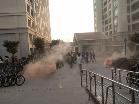 早晨,七点未到,一些同学还没从睡梦中醒来,各岗位的工作人员就均已就位。他们在各个角落安放好发烟装置,并等待着指令放出烟雾,映雪宿舍内的消防通道也均已清空障碍,封闭的铁门打开,所有电梯都已经停用,一切,都准备就绪。