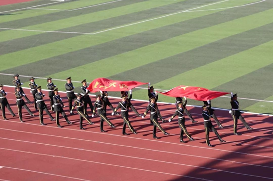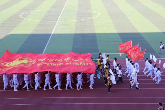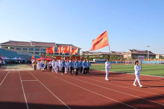 待所有代表队入场,主持人简单介绍到场领导。升国旗,奏国歌后,校长助理陈光老师致开幕辞。