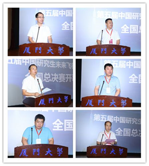 本次大赛受到各方高度重视,教育部学位与研究生教育发展中心主任助理赵瑜,中国科学院院士、厦门大学副校长韩家淮,厦门大学校长助理、翔安校区党工委书记、管委会主任陈光,福建省教育厅高等教育处处长、福建省学位委员会办公室主任张文东,中航工业沈阳飞机设计研究所副所长林鹏,航天科工集团三院三十一所副所长郭昆,西北工业大学研究生院副院长、学工部副部长查钢强以及来自北京航空航天大学、南京航空航天大学、西北工业大学等8所高校以及3家研究院所嘉宾莅临开闭幕式。福建省教育厅高等教育处处长张文东,厦门大学校长助理陈光、沈阳飞机设计研究所副所长林鹏、中国航天科工集团三院三十一所副所长郭昆分别致开幕辞。南京航空航天大学教授、博导,中国航空学会理事昂海松作了题为《浅谈未来飞行器创新设计》的主题报告。教育部学位与研究生教育发展中心主任助理赵瑜、厦门大学副校长韩家淮院士分别在闭幕式致辞。