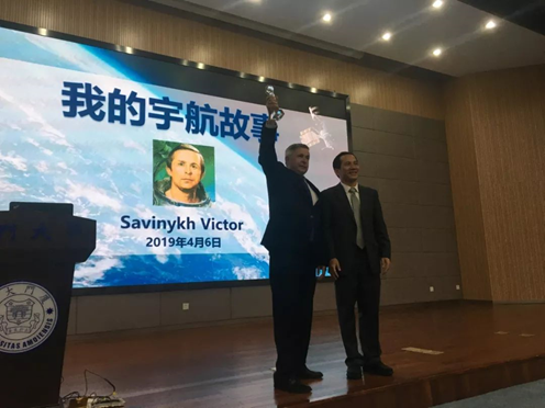 Savinykh Victor首先表示了对厦门大学98周年校庆的祝贺以及对厦门大学学子的祝福。紧接着他介绍了自己的母校与大学专业。正是因为自己的专业,他当时接触了一些宇航员,并在之后通过层层选拔成为了一名宇航员。1981年他第一次进入太空,他表示飞行过程带给人的感受无疑是痛苦的,但由于之前已经做过很多训练,他最终还是坚持了下来。这一坚持,就让他在“礼炮6号”上一共度过了80个昼夜。