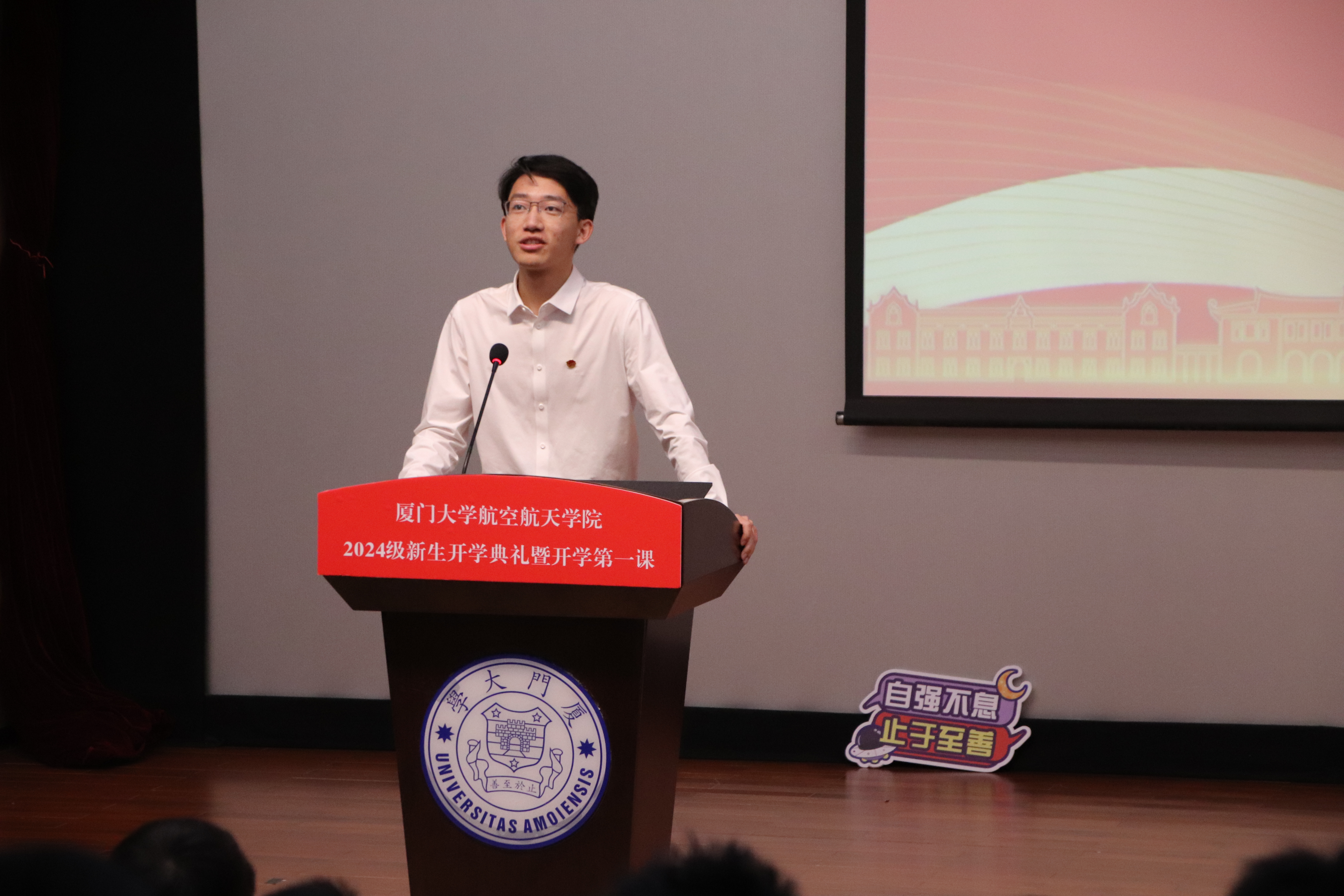 飞行器系主任、先进空天动力工程研究中心主任朱呈祥作为教师代表发言。他谈到,面对厦门大学广阔的校园与多元化的环境,新生们常面临着适应挑战。大家既要避免固守旧习、错失校园美好,也要警惕无度放纵、迷失方向。为此,他提出了大学学习的四个关键方面:专业知识、身心健康、处世之道、人生视野。此外,他还鼓励同学们珍惜大学时光,注重理论与实践相结合,积极参与科创活动,力争全面发展。