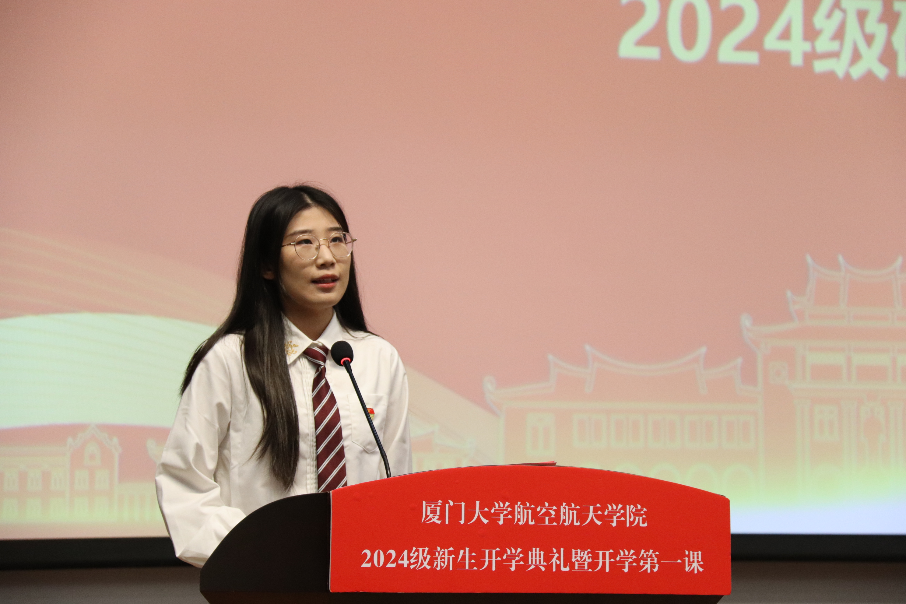 2023级本科生杨洲作为老生代表发言。他分享了自己入学以来有关享受美好校园生活、追求广博学识、探寻自我多向发展等方面的感悟,特别强调了大一学年承上启下的关键作用,鼓励新生们珍惜青春、勇于探索,成就最美好的自己。2024级硕士生郝苑雯作为新生代表发言。她回顾了自己本科四年的成长,感恩学校、学院与师长的悉心培养,并与全体2024级新生共勉,要坚定信念、迎接挑战,规划未来、不负时光,脚踏实地、胸怀家国,不负韶华、砥砺前行。