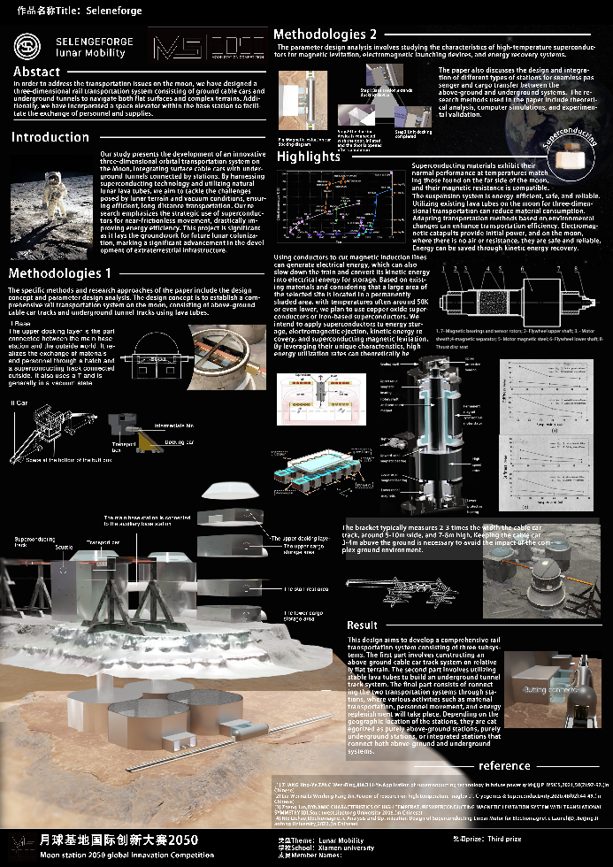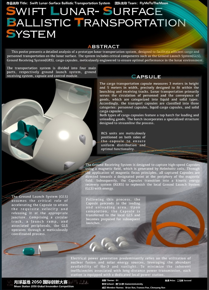 厦门大学航空航天学院的FlyMeToTheMoon和SeleneForge两组参赛队伍分别获二等奖及三等奖。参赛队伍基于月球环境特征,提出利用月球上的原位资源解决月球交通运输的方案。队员们开拓思维完成方案设计,创新利用月球上的极端温度设计超导体结构来减少阻力、利用电磁推进系统来有效地利用能源、利用月球的真空和低重力环境创建了抛物线运输方式。在学院老师和学生的共同努力下,历经6个月的备赛、初审、复赛等环节角逐,最终取得佳绩,丰富的想象与成熟的方案获得了评委会的赞许。