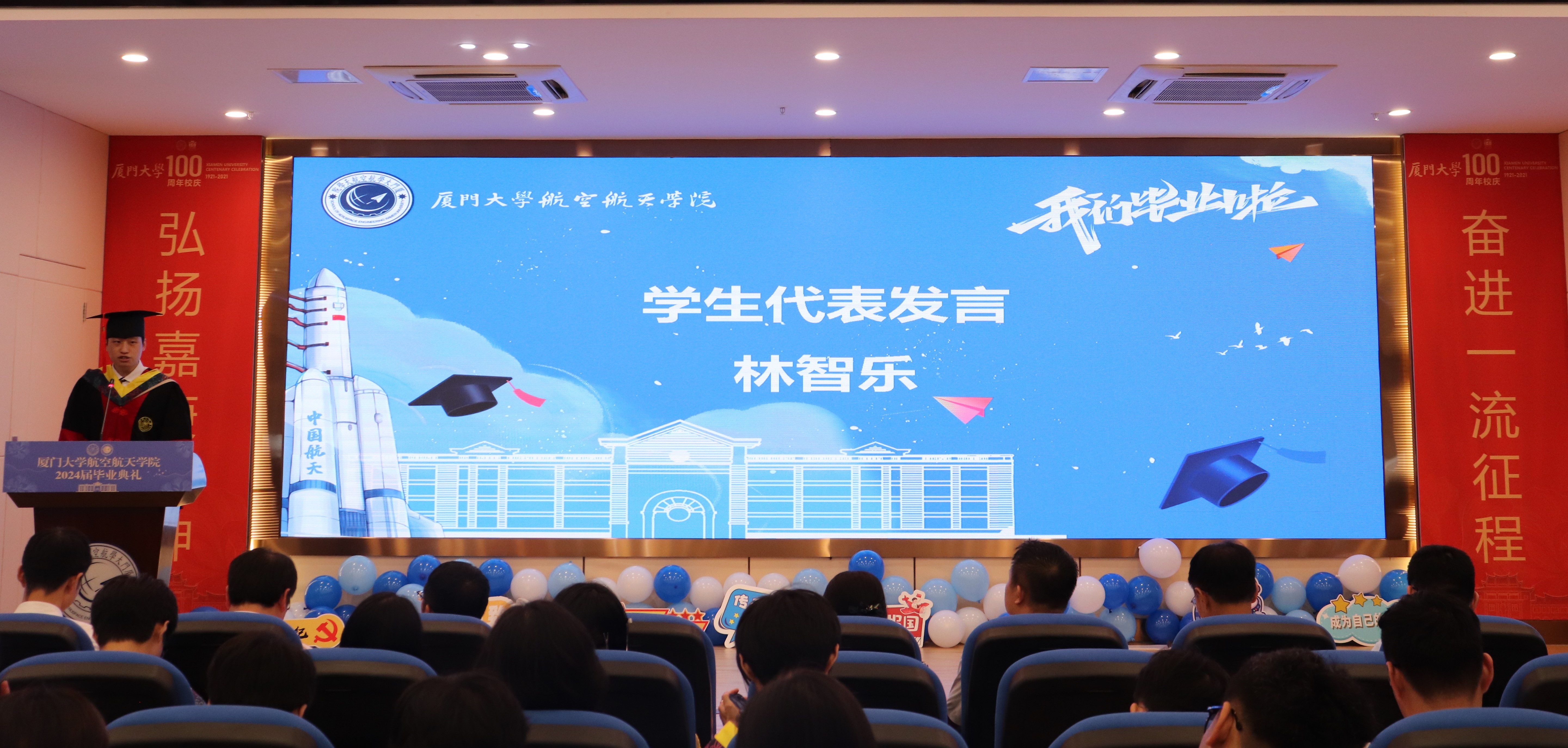 钟易晟、郭小暄和林智乐分别作为2024届本、硕、博毕业生代表发言。他们深情回顾了在厦园求学、努力拼搏的难忘时光,并对学院给予的支持与帮助、对师长的谆谆教诲与亲切关怀表示由衷的感谢。他们共同向航空航天学院2024届毕业生发出倡议,要秉承“自强不息,止于至善”的校训精神,坚定报国信心,将理想抱负与“空天梦”“强国梦”有机结合,为实现中华民族伟大复兴贡献青春力量。