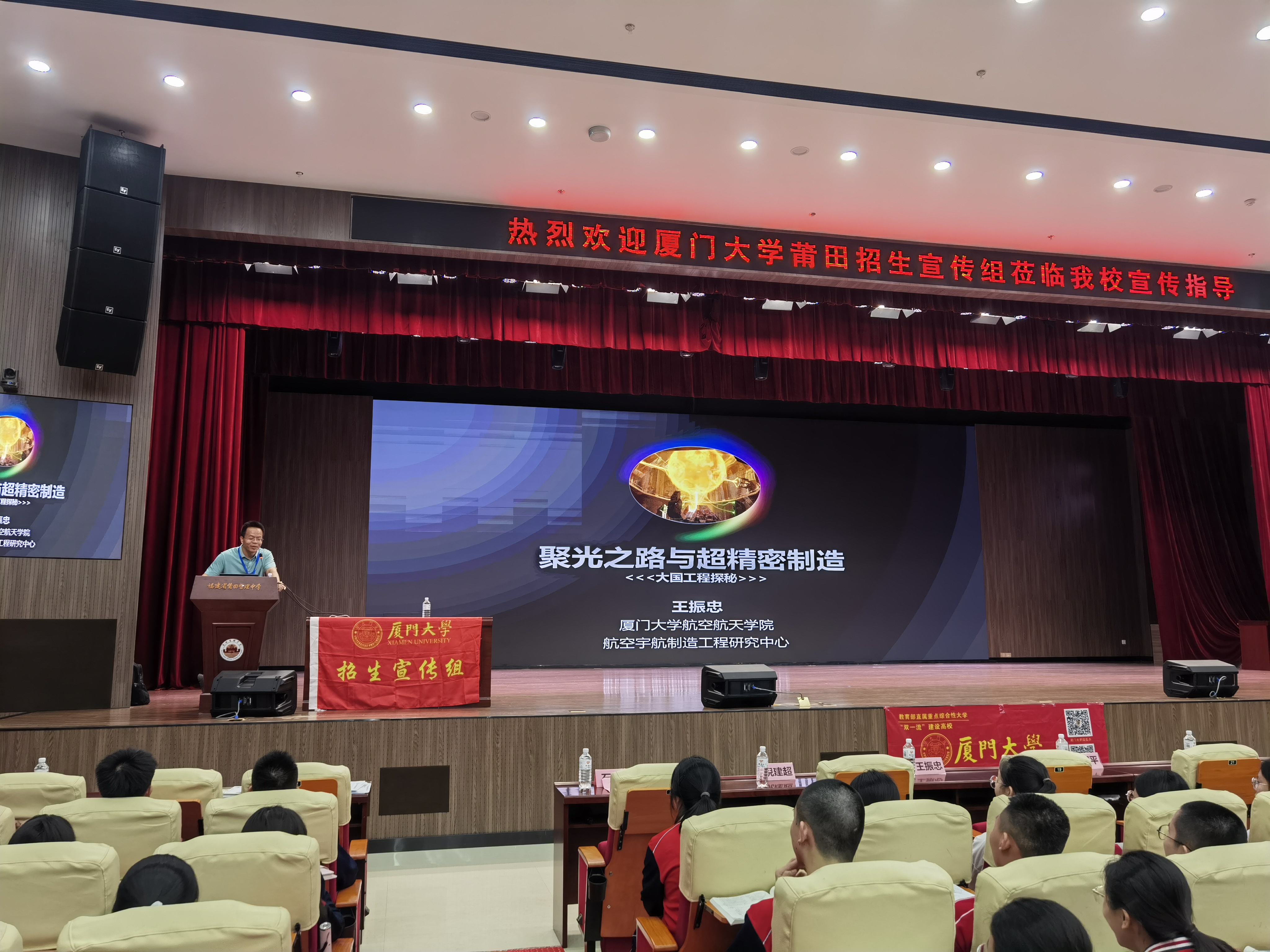航空航天学院航空宇航制造工程研究中心主任王振忠教授为两校师生带来了题为《聚光之路与超精密制造》的专题讲座。王教授以其渊博的学识与前沿的视角,揭秘了大国重器—激光聚变装置背后的故事,揭示了超精密制造技术的关键作用,展示了厦门大学在这一科技前沿的卓越贡献。这场融合了科技深度与人文温度的讲座,赢得了在场师生的阵阵掌声,激发了同学们投身科研、探索未知的热忱。