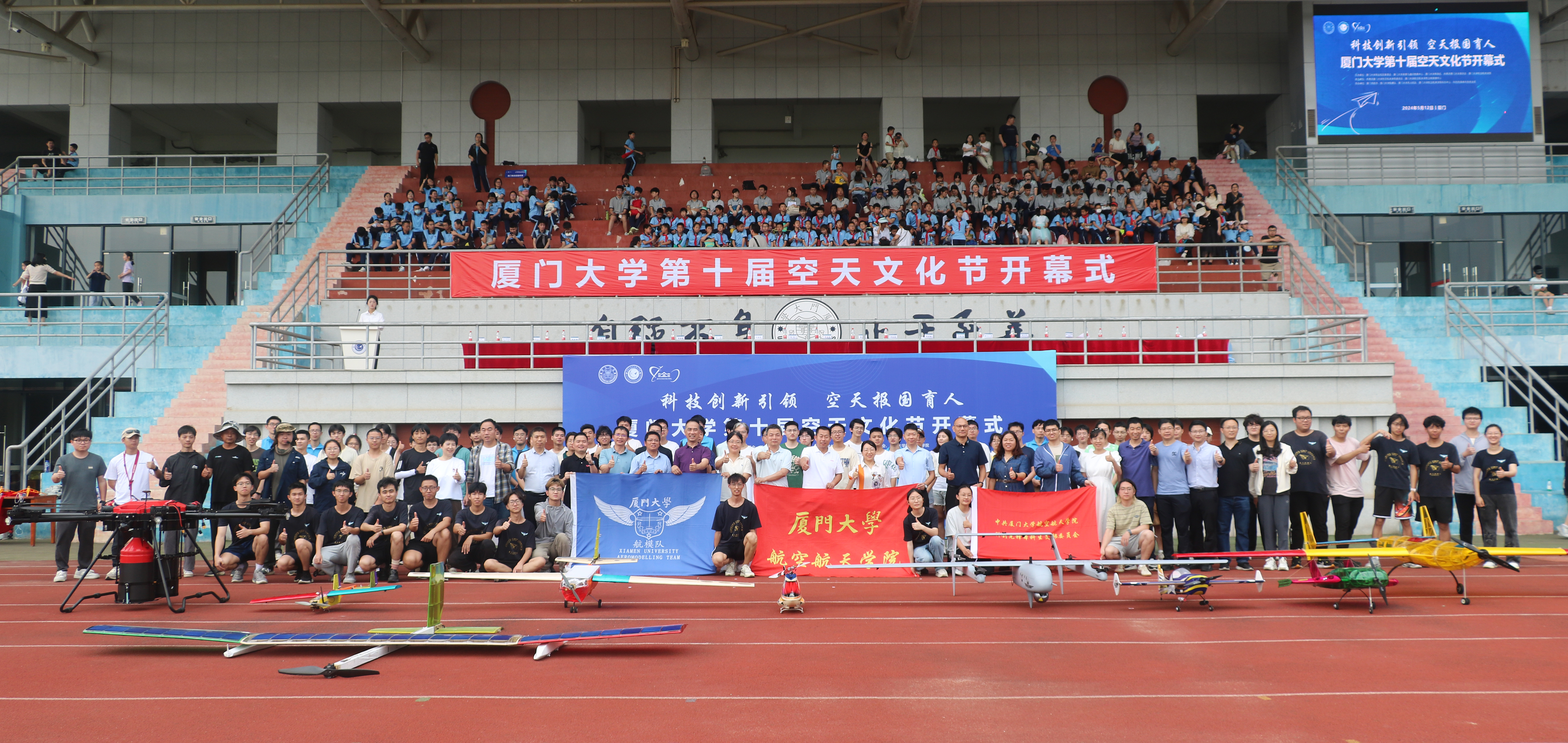 5月12日,厦门大学第十届空天文化节开幕式在翔安校区一期田径场举行。翔安校区管委会副主任、后勤集团党委书记马龙,航空航天学院党委书记廖志丹,学校办公室副主任、翔安校区办公室主任薛志平,教务处副处长、翔安校区教务办主任何海涛,厦门大学附属科技中学副校长吴忠露,厦门市航协党支部书记纪宏毅,厦门市航协会长黄佳毅,航空航天学院党委副书记林蔚等出席开幕式。翔安校区师生代表及厦门一中、厦门外国语学校、厦门大学附属科技中学、厦门海沧实验中学、厦门市演武小学、厦门市松柏第二小学等中小学师生代表近300人参加活动。