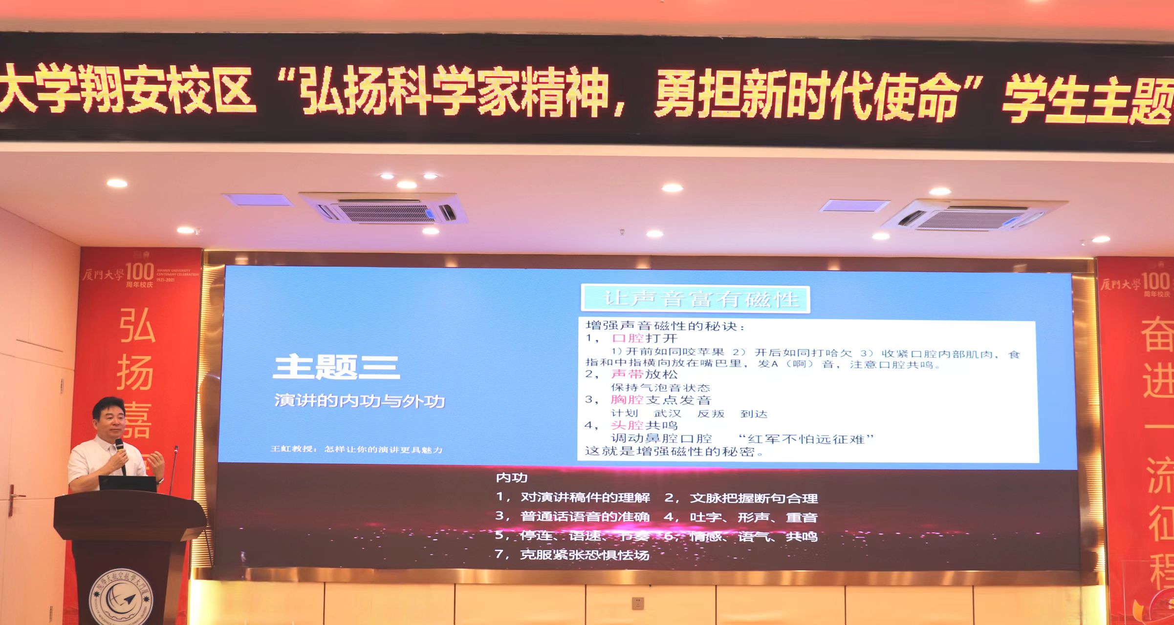 5月7日,由厦门大学翔安校区主办的“弘扬科学家精神 勇担新时代使命”学生主题微宣讲专题培训第二场讲座在航空航天学院大楼547报告厅顺利举办。本次培训邀请了演讲专家王虹教授亲临指导。