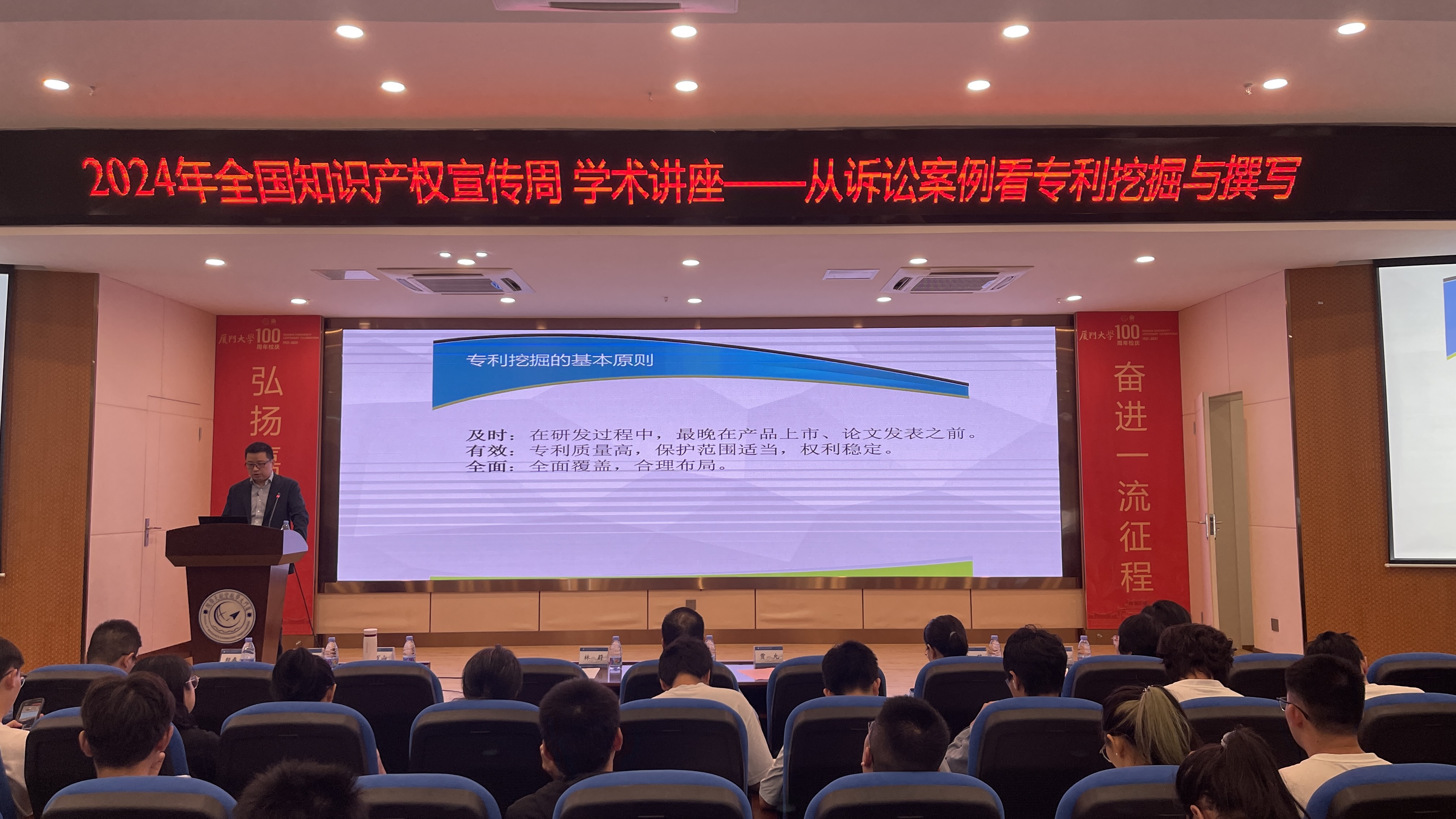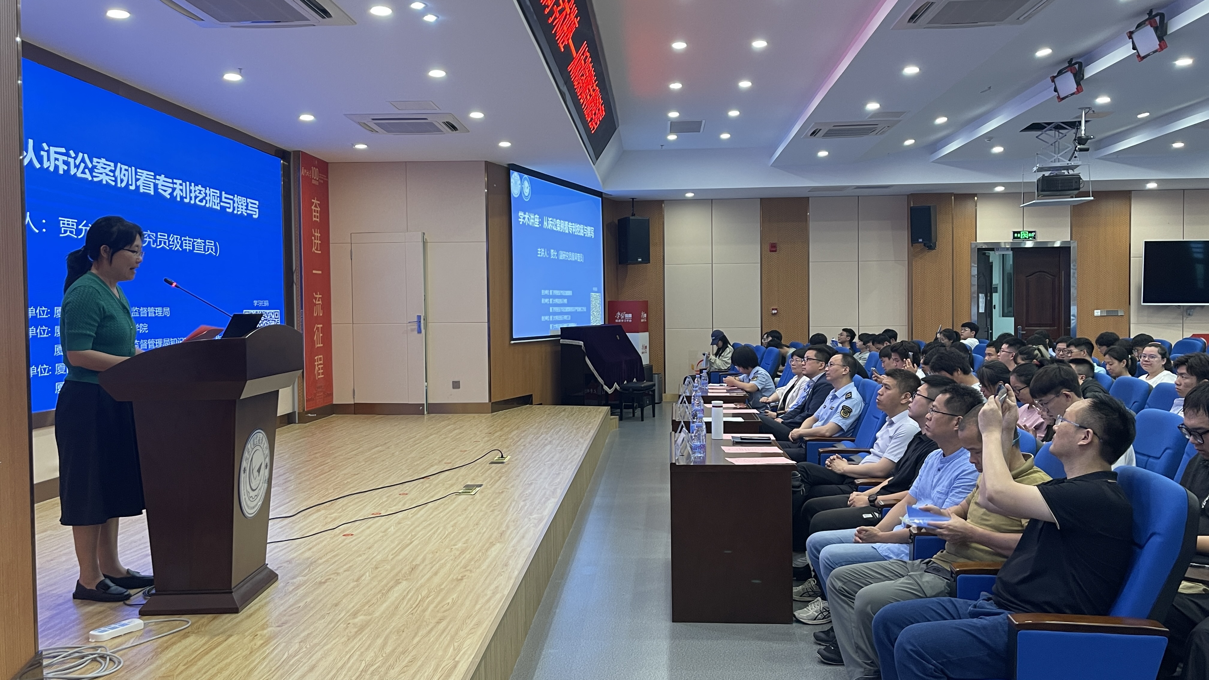 4月20日,2024年全国知识产权宣传周活动线上启动,为响应宣传周活动精神,服务高质量发展,促进知识产权转化运用,4月22日下午,厦门大学航空航天学院联合翔安区市场监督管理局知识产权维权工作站在学院大楼547报告厅举办主题为“从诉讼案例看专利挖掘与撰写”的定制培训讲座。翔安区市监局知识产权工作站专家、广州三环专利商标代理有限公司副总经理贾允作为本次讲座主讲人。翔安区市场监督管理局副局长陈火号、市场科(知识产权科)科长王芳、中队长黄夏菁以及我院党委副书记林蔚、工会主席殷春平、工程管理中心主任刘万山出席本次活动。讲座由林蔚主持,吸引了近200名师生聆听。